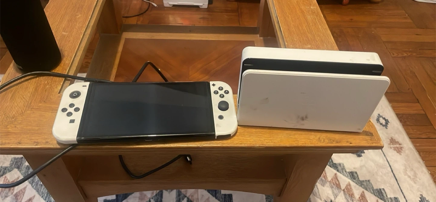 This is a white Nintendo Switch OLED model. It's the console with detachable Joy-Cons and a dock. The console and dock are white.