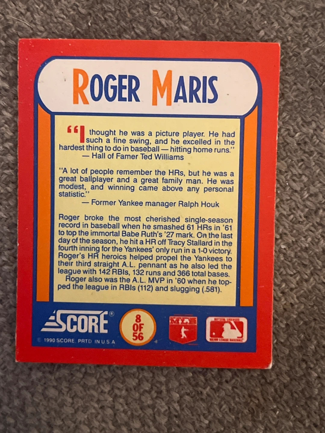 1990 Score Roger Maris Baseball Card
