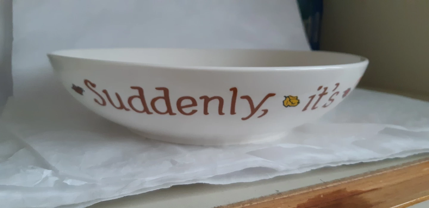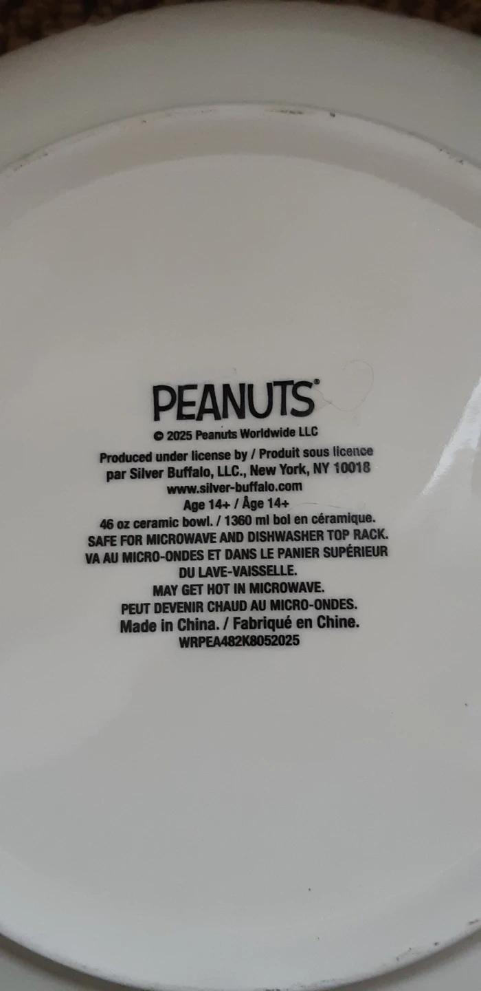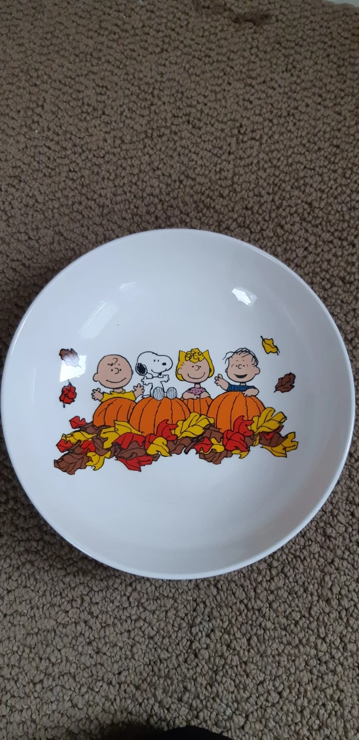 This is a really cute Peanuts ceramic bowl with a fall theme.