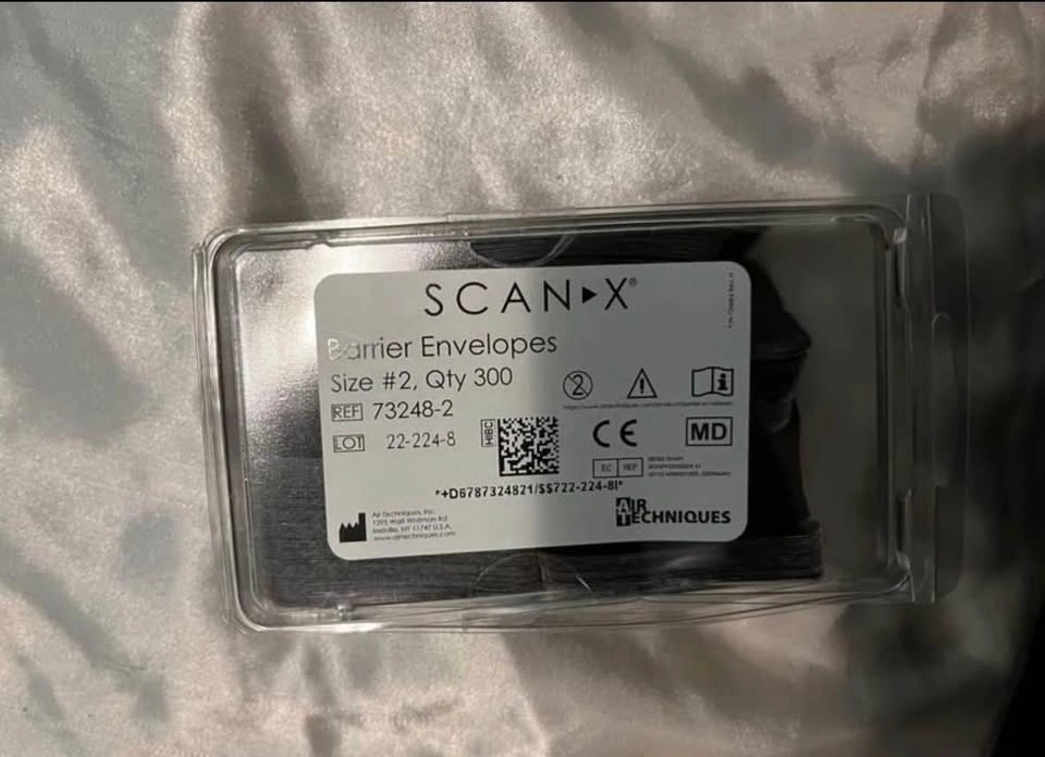 Box of SCANX #1 and #2 Barrier Envelopes. ScanX intraoral phosphor plates, sizes 1 and 2, complete with original box and included barriers. Ideal for radiography training in educational settings.