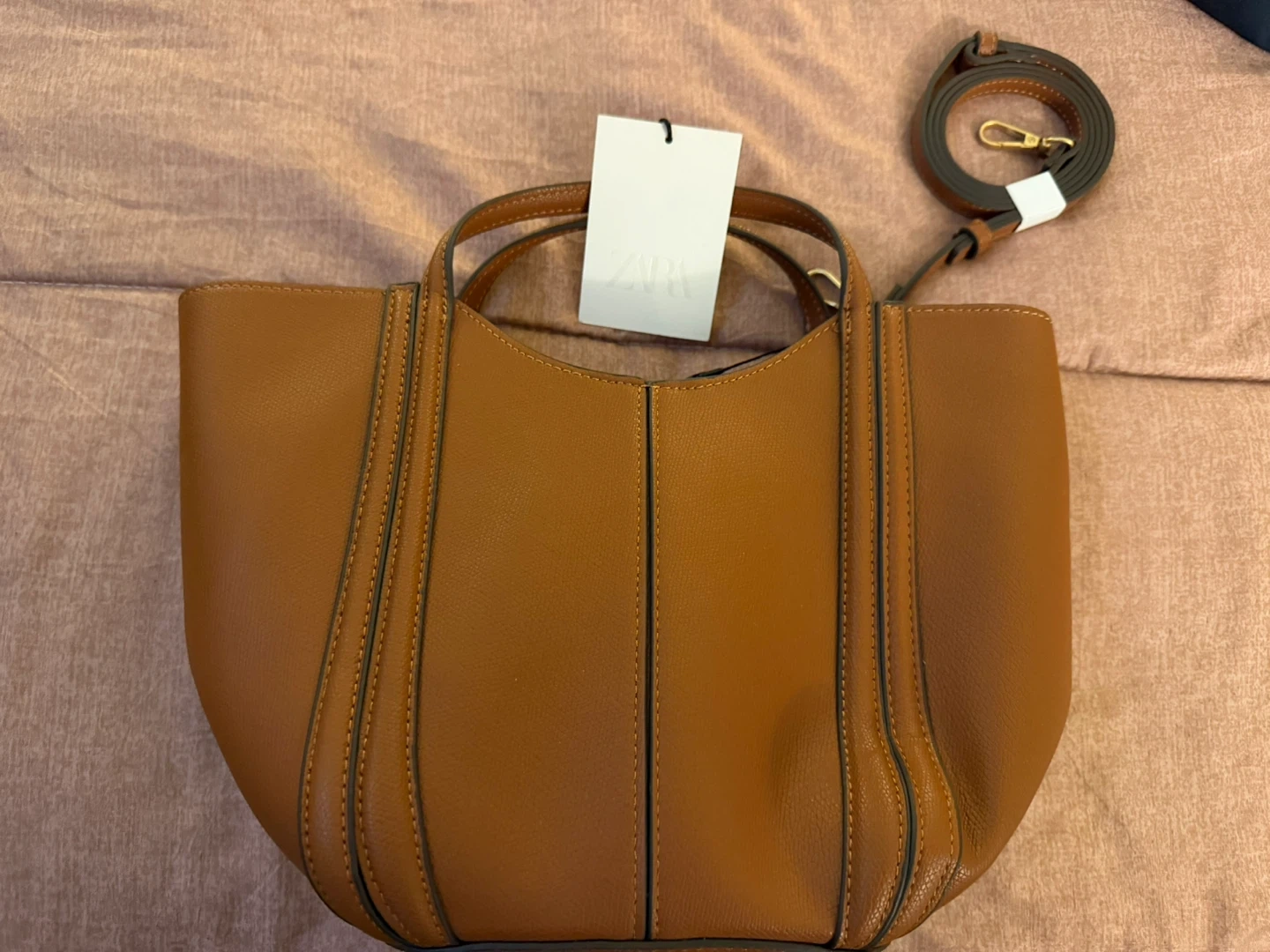 This is a brown leather tote bag from Zara. It features a structured design with dual top handles and an optional crossbody strap. The interior has a zippered compartment and pockets for organization.