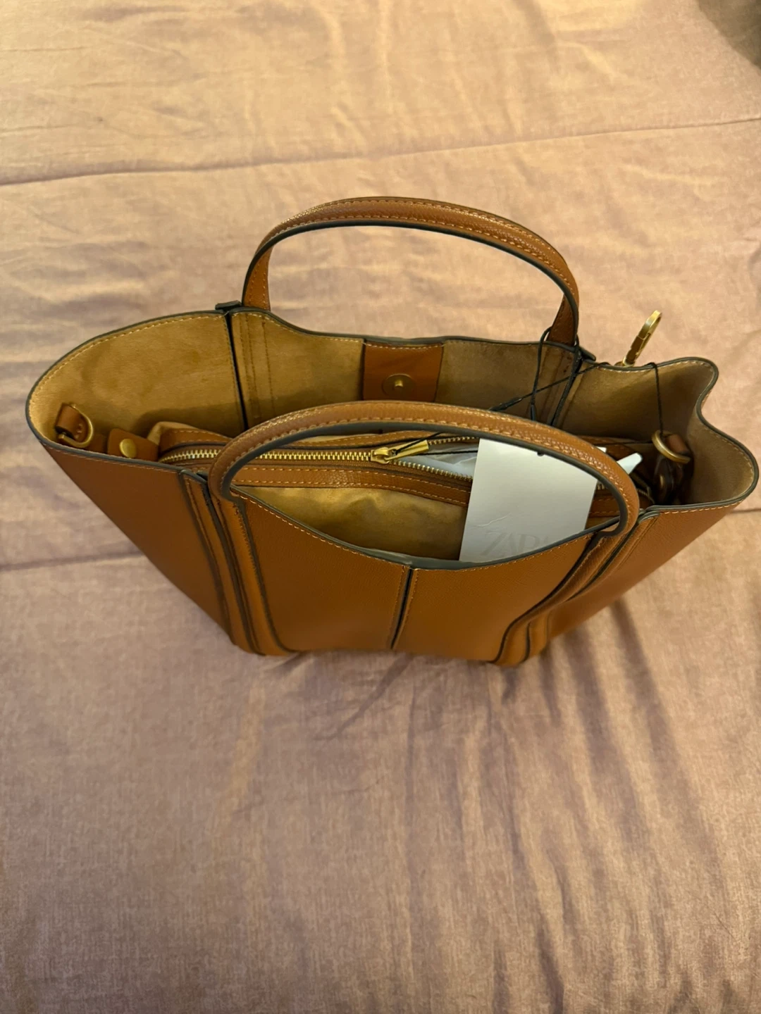 This is a brown leather tote bag from Zara. It features a structured design with dual top handles and an optional crossbody strap. The interior has a zippered compartment and pockets for organization.