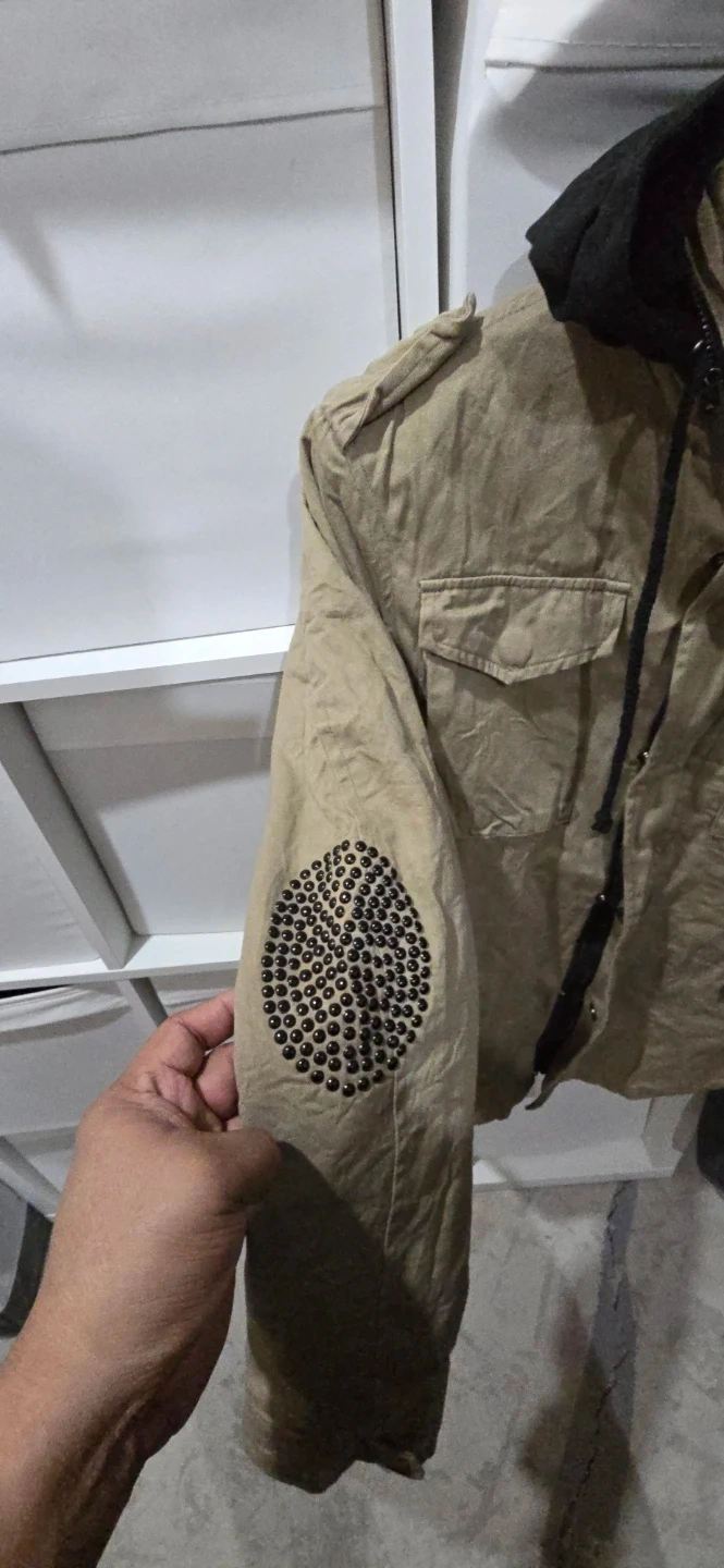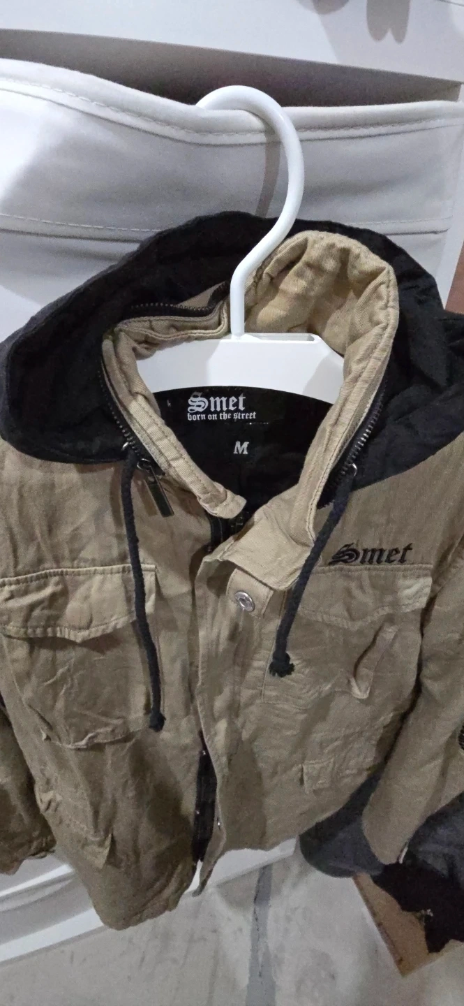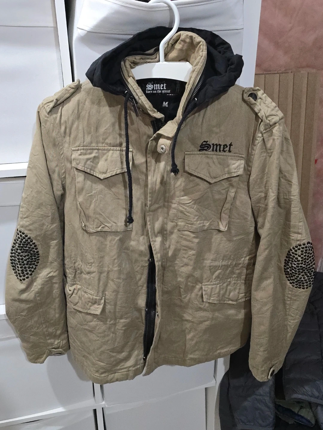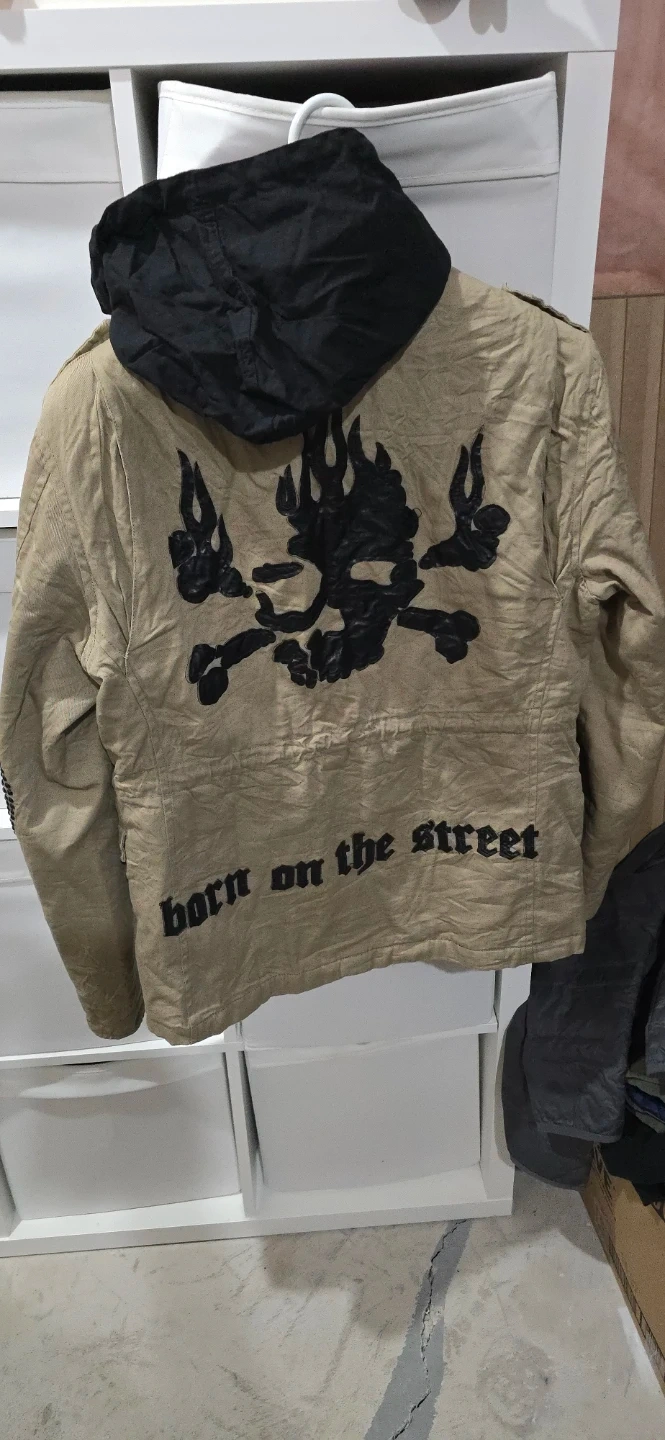 This Smet jacket features a tan exterior with a black hood and "born on the street" graphic. It has a size medium tag and studded detailing on the elbows. It comes with multiple pockets.
