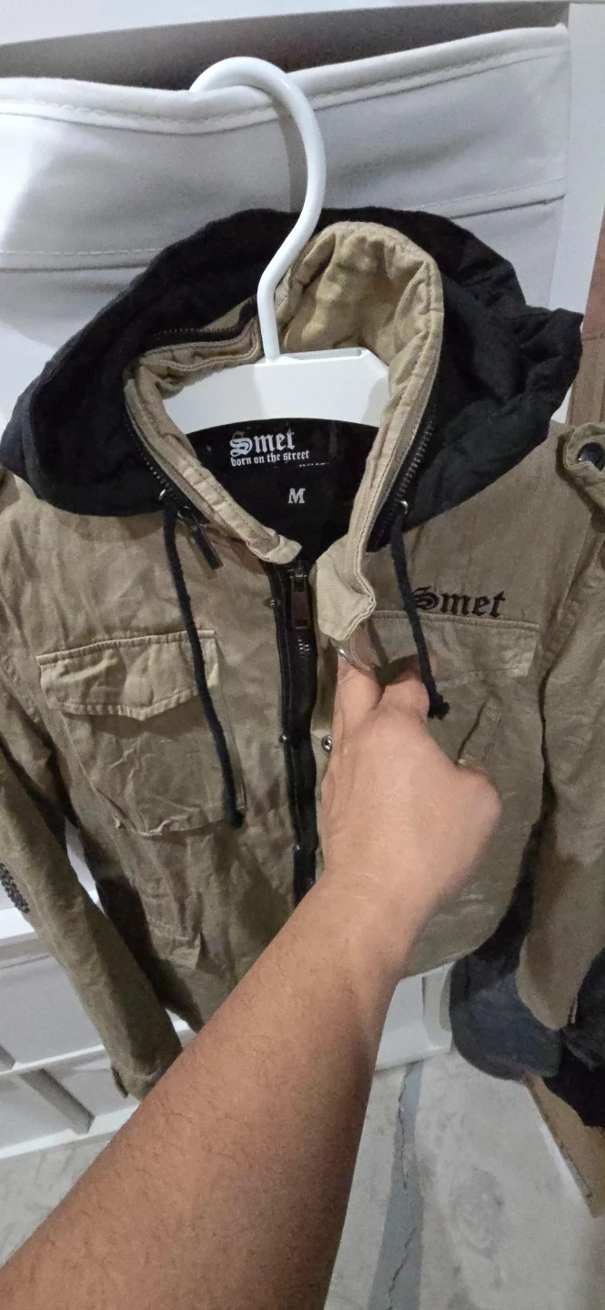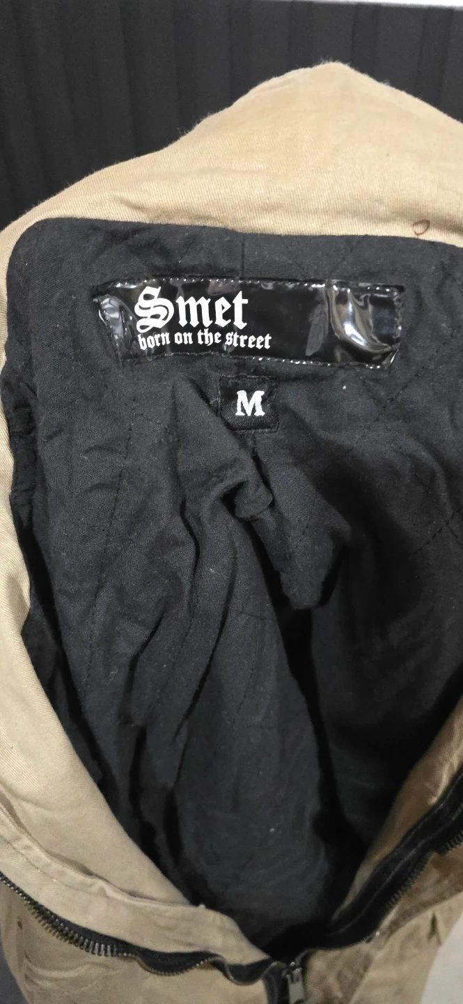 This Smet jacket features a tan exterior with a black hood and "born on the street" graphic. It has a size medium tag and studded detailing on the elbows. It comes with multiple pockets.