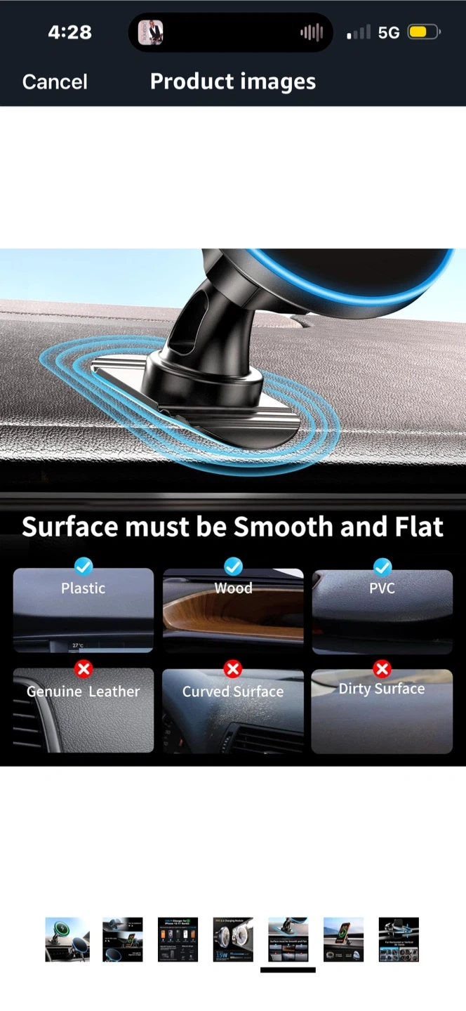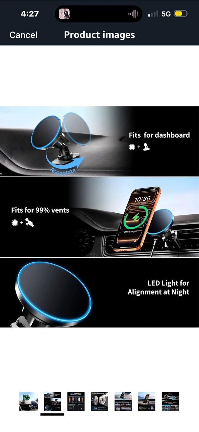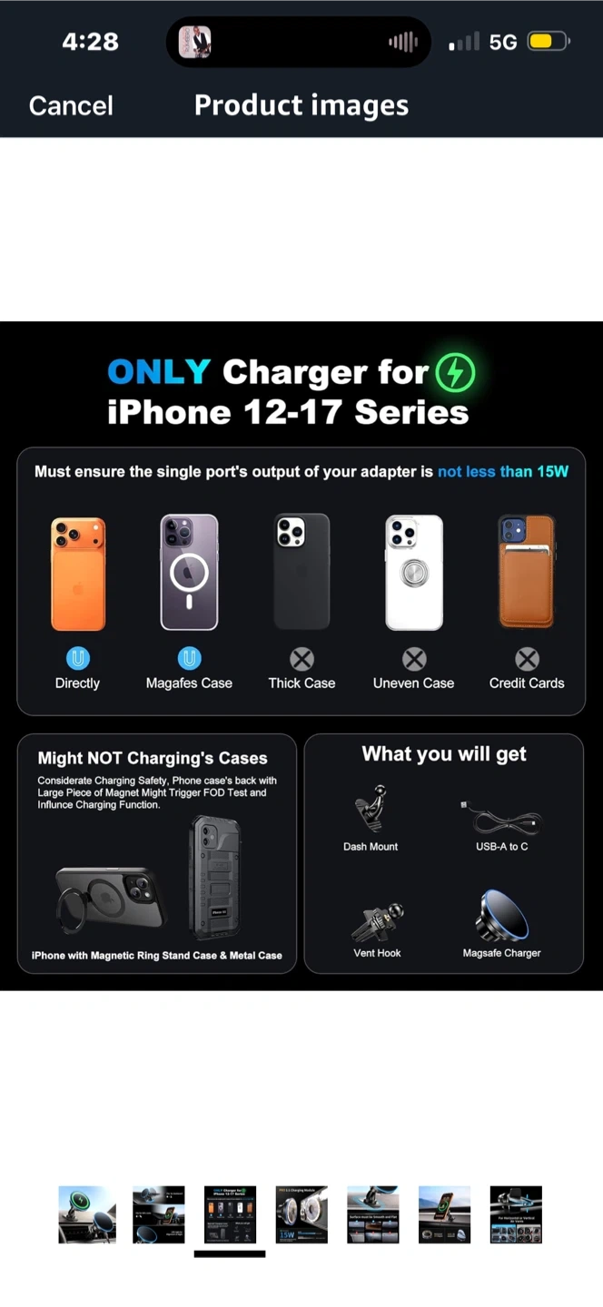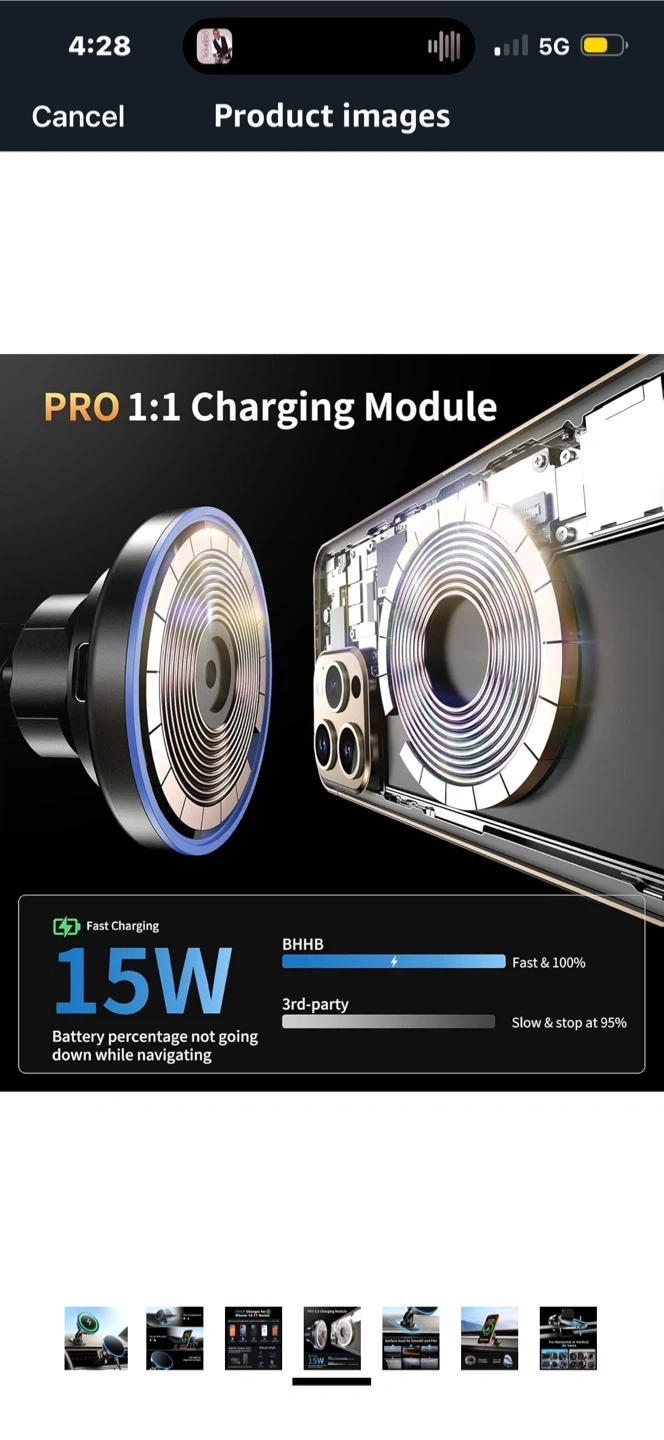 BHB MagSafe car mount charger with 15W fast charging capability. Includes dash mount, vent hook, and USB-A to C cable. Fits for dashboard or 99% of car vents.