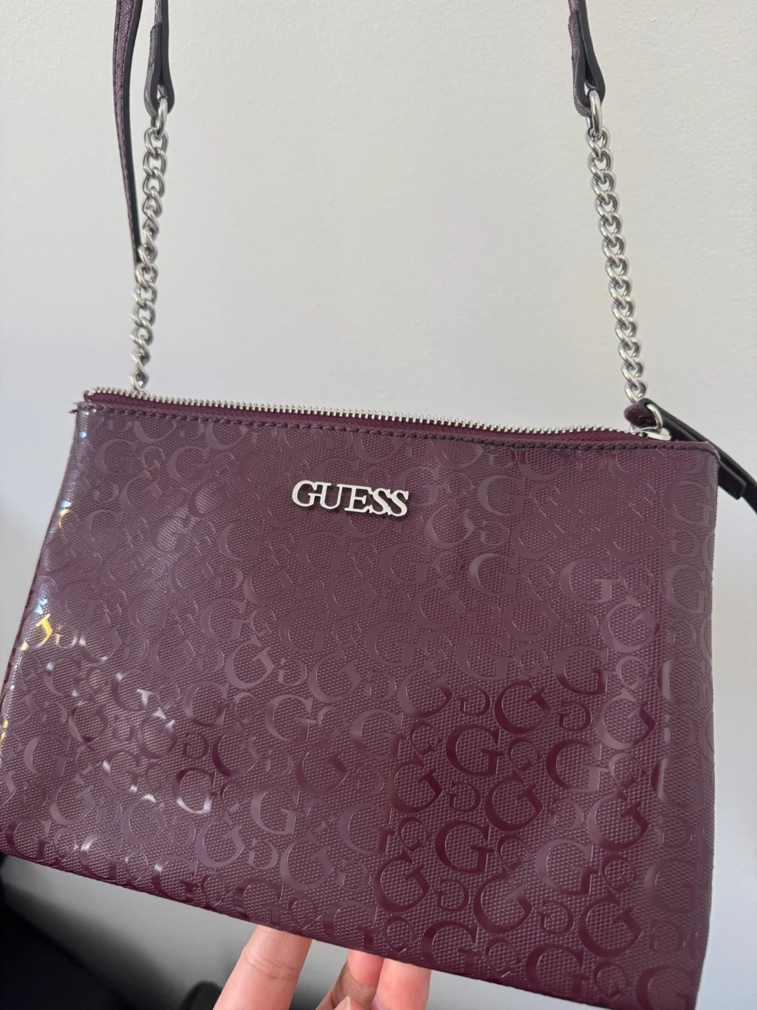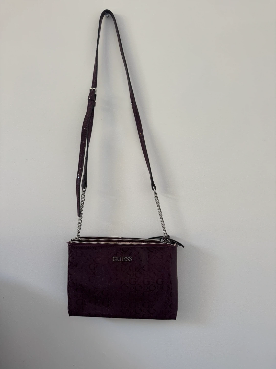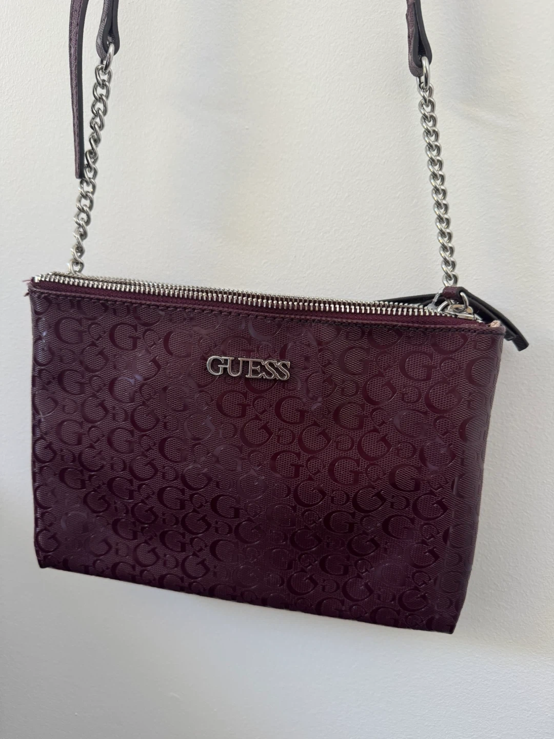 This Guess crossbody bag is a deep burgundy colour with an all-over embossed 'G' pattern. It has multiple zippered compartments inside and a silver-tone chain strap. It's a stylish and practical accessory for everyday use!