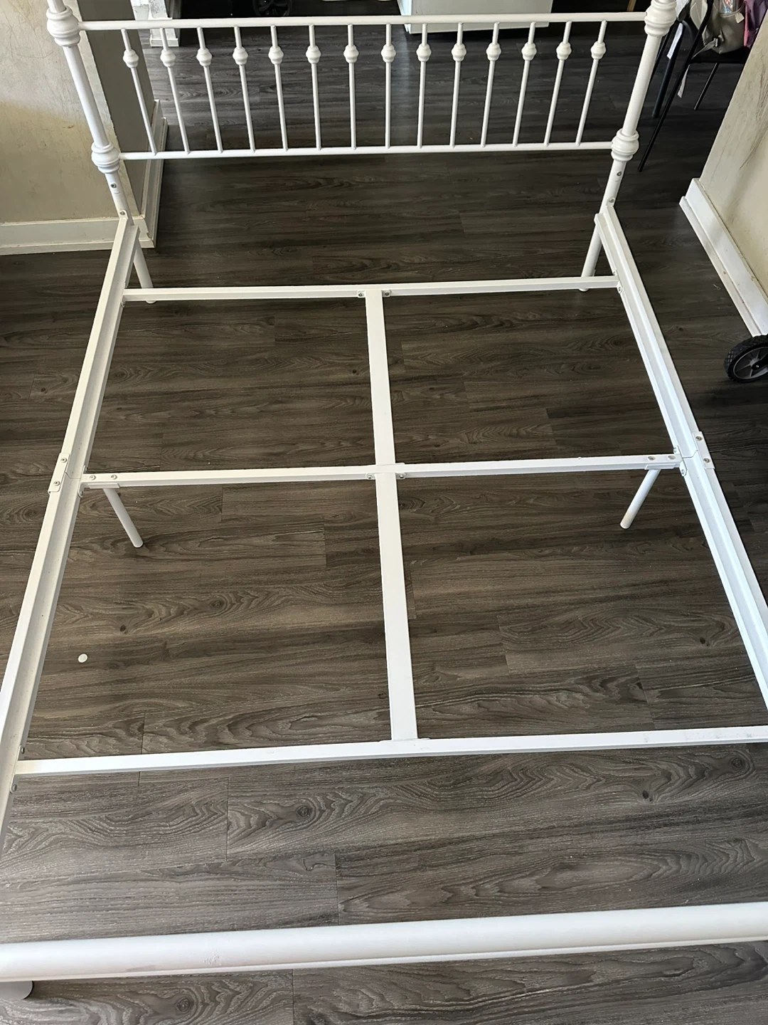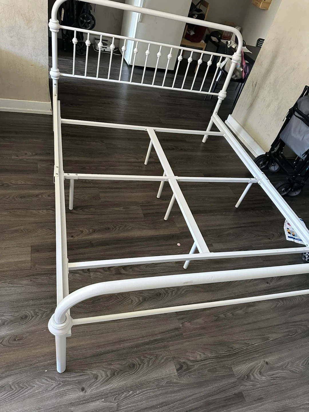 White metal bed frame with a classic design. It's a sturdy frame that'll support your mattress well. This bed frame is a queen size. It's perfect for giving your bedroom a timeless look!