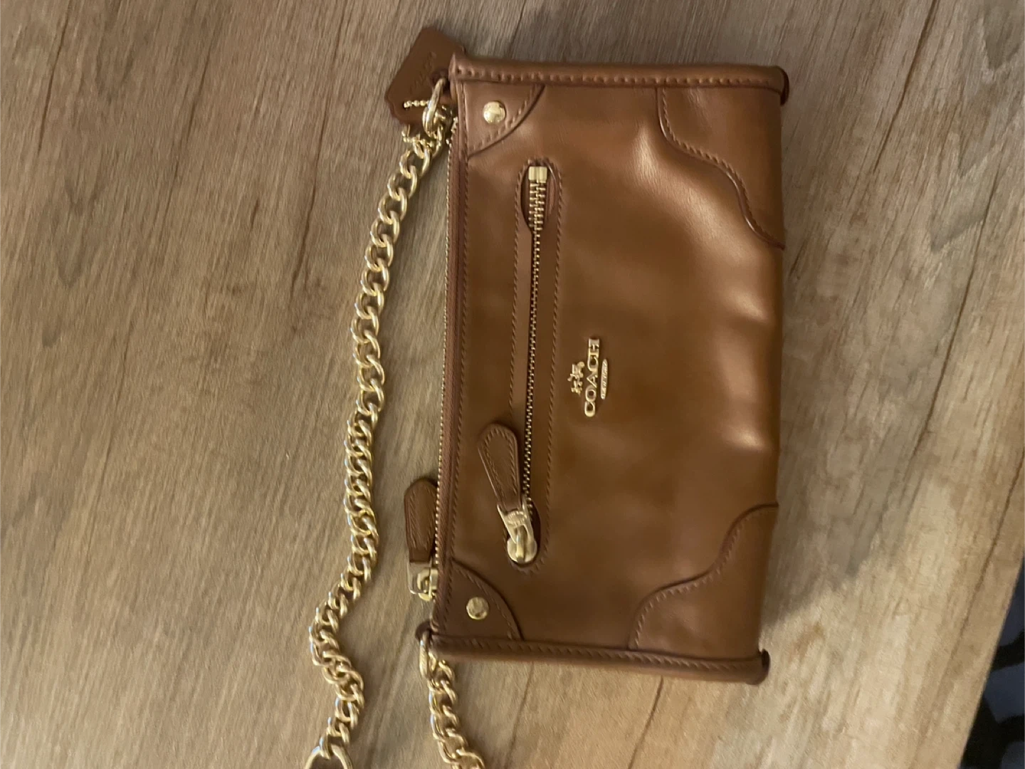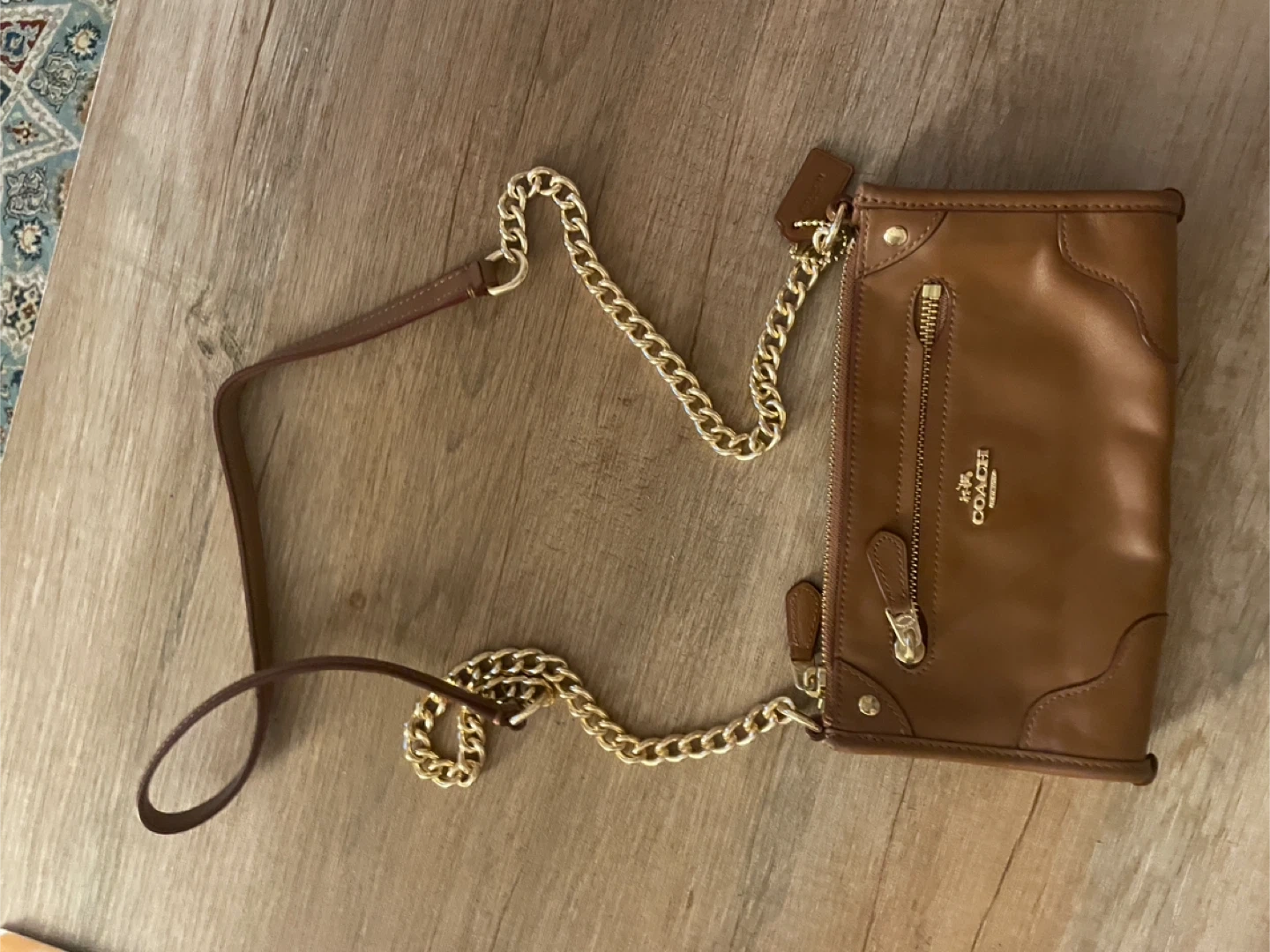 Check out this stylish Coach crossbody bag! It's a beautiful brown colour and made of leather. The bag features a gold chain strap and a zippered pocket on the front. Perfect for adding a touch of elegance to any outfit