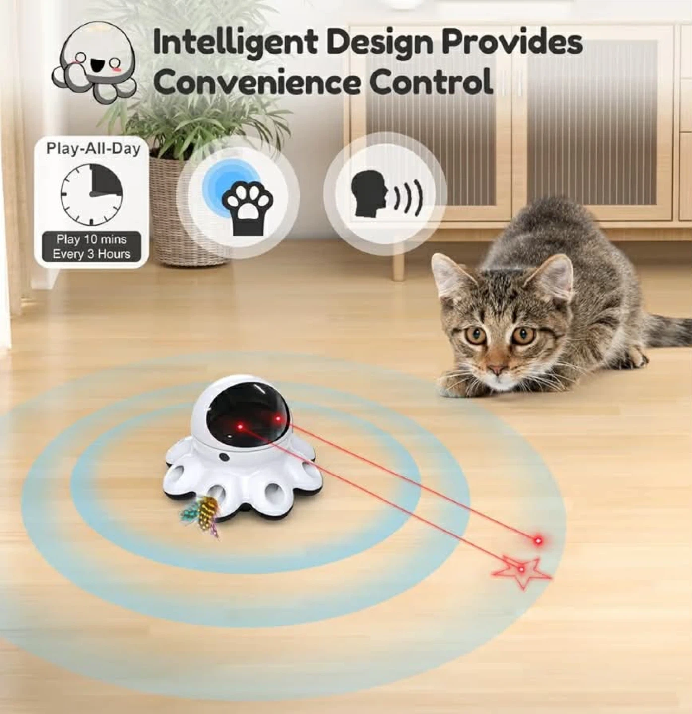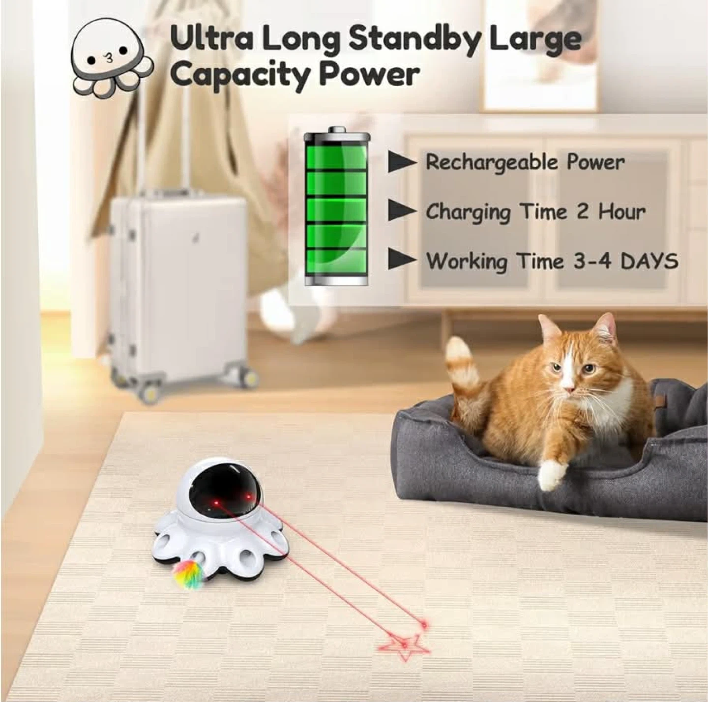 This ORSDA 2-in-1 cat toy features an automatic laser pointer and a whack-a-mole game. It's rechargeable with a 2-hour charge time offering 3-4 days of working time. Comes with USB charging cable and interchangeable feather/brush attachments for extra fun!