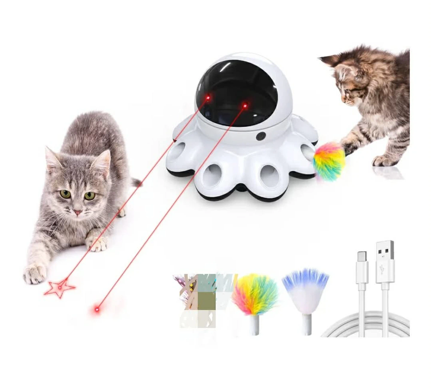 This ORSDA 2-in-1 cat toy features an automatic laser pointer and a whack-a-mole game. It's rechargeable with a 2-hour charge time offering 3-4 days of working time. Comes with USB charging cable and interchangeable feather/brush attachments for extra fun!