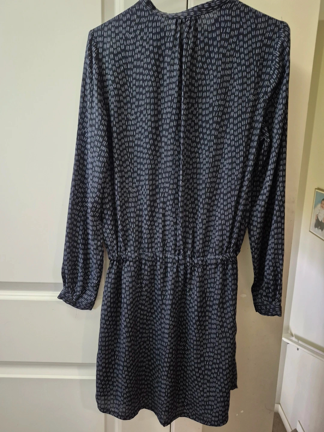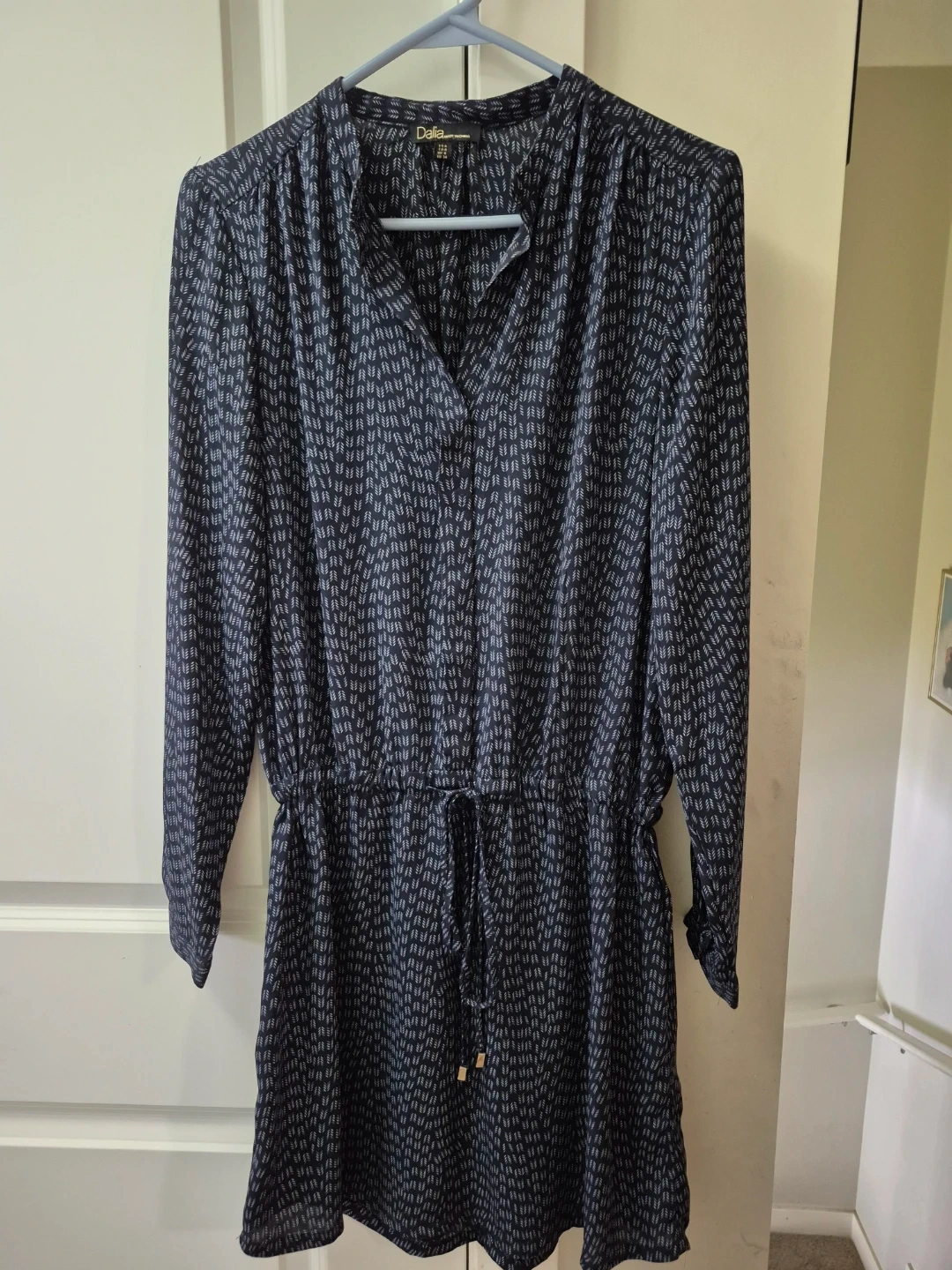 Chic navy blue Dalia dress with a subtle all-over print. It features a cinched drawstring waist and long sleeves. Dress size is a Canadian 4. Take it for $5. Pick-up location 333 Taralake Way NE.
