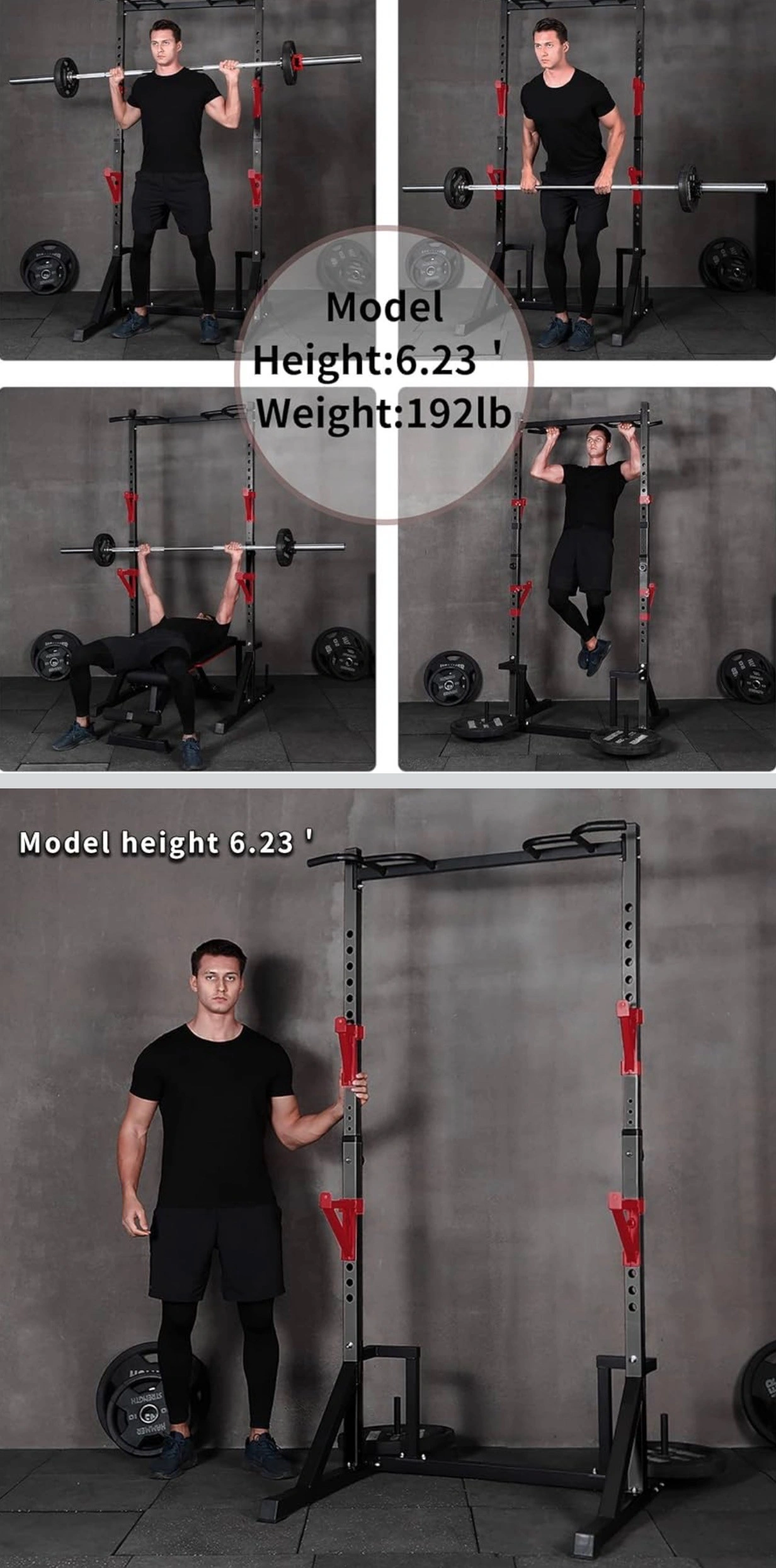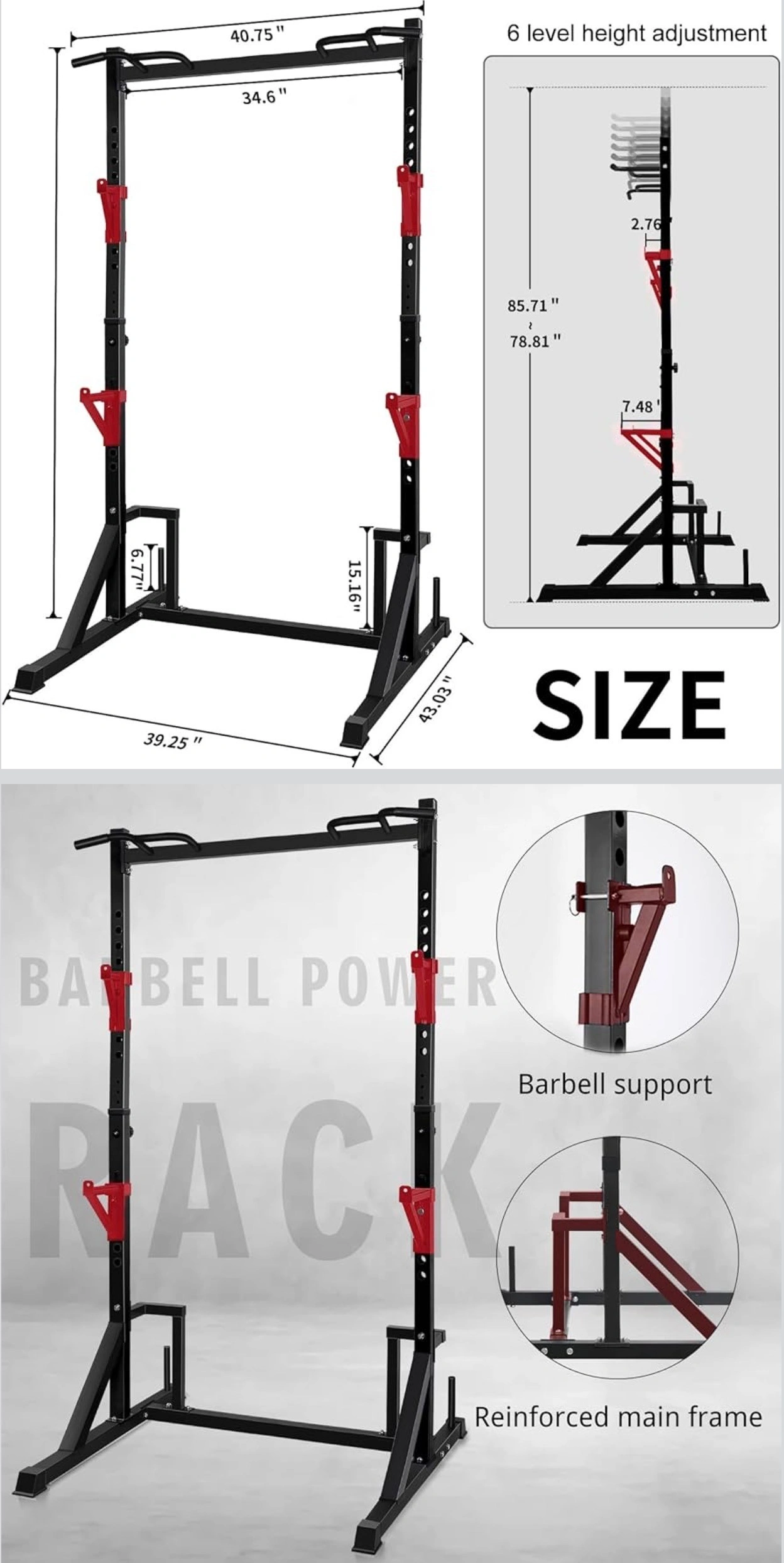 ADJSTABLE BARBELL SUPPORT ARMS & HEIGHT:Single-side 17-hole barbell support arm with random height plus the main frame 6-speed height adjustment weight rack, whether doing squats or bench press can be well adapted to different heights and different parts of the exercise needs. Standard 1in adjustment hole to accommodate most market accessories.