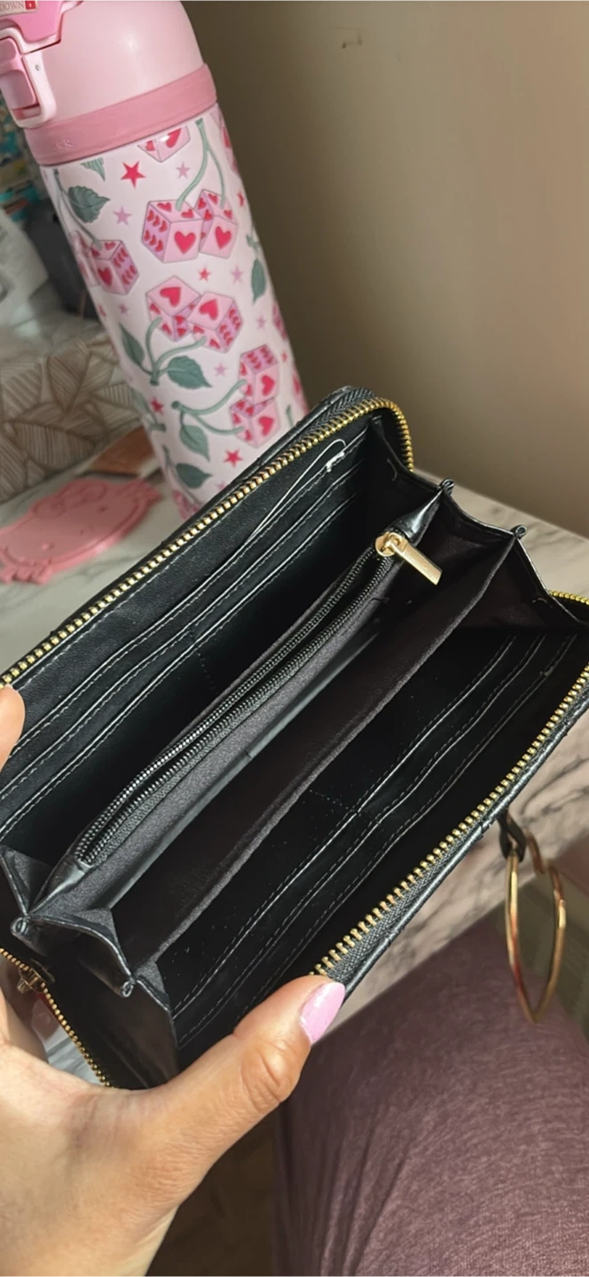 Black quilted wallet with gold zipper closure. It has multiple card slots and zippered compartments. A cute heart shaped wrist strap is attached.
