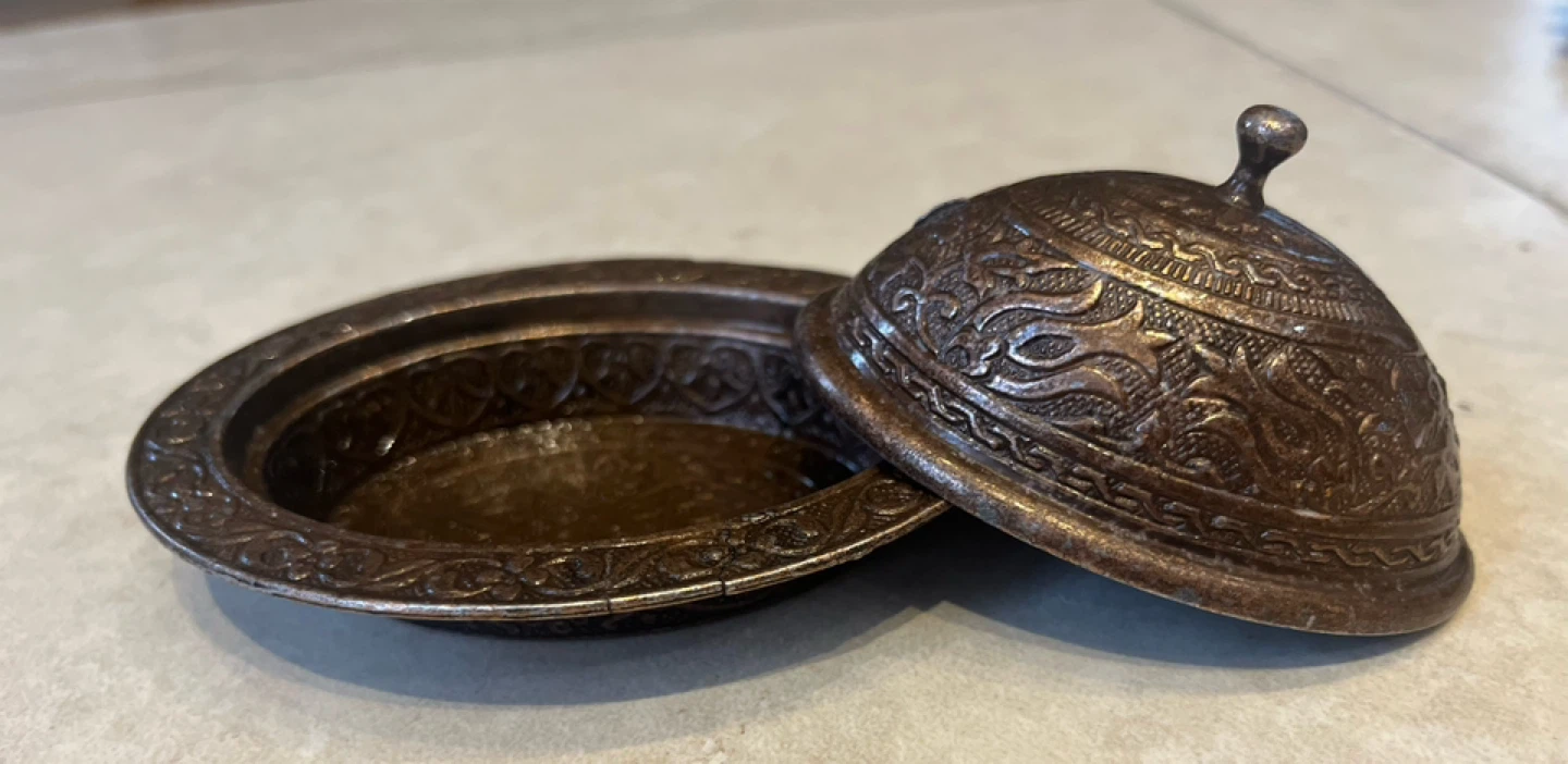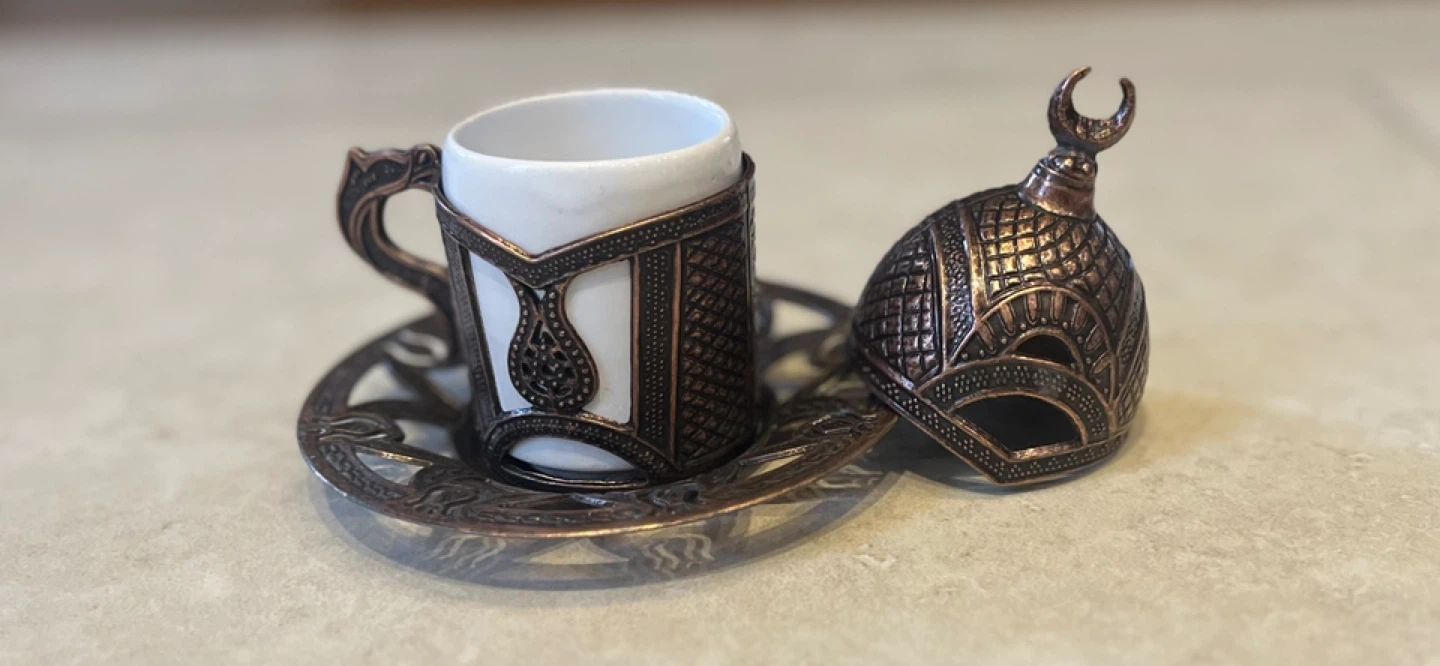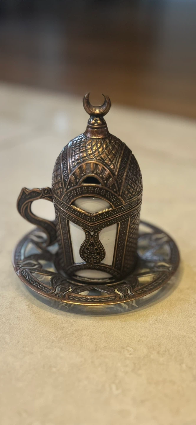 Selling a beautiful Turkish coffee set by Platin Turke. This set includes six cups with lids and saucers, as well as a serving dish with a lid. The intricate designs and detailed craftsmanship make this set a unique addition to any home