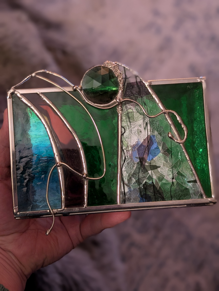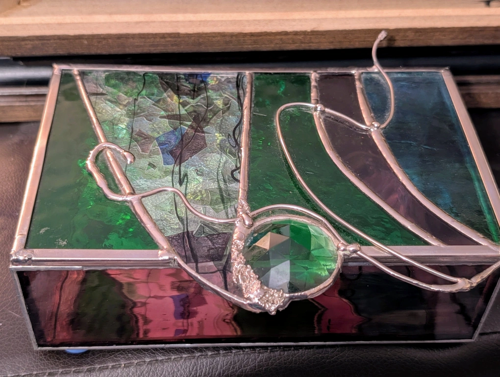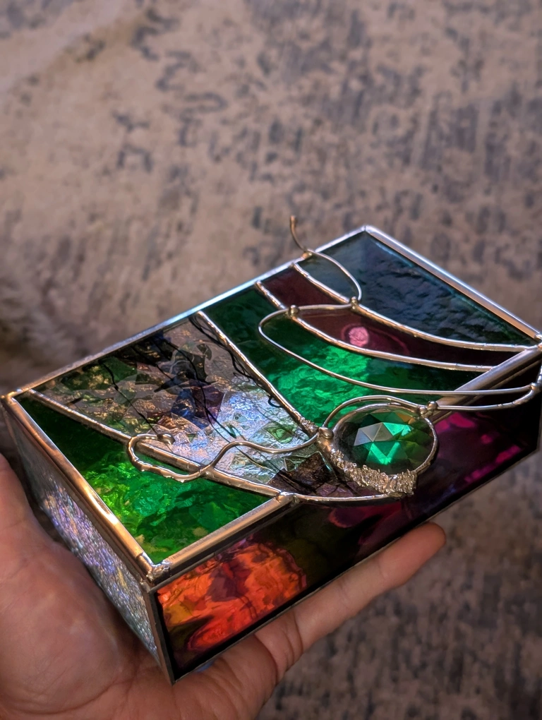 Rectangular stained glass jewellery box. Features green, purple, and iridescent glass. Silver toned metal frame. Includes a faceted green gemstone accent. Small and compact.