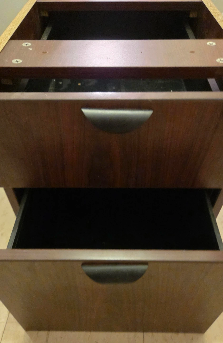 This is a two-drawer filing cabinet with dark wood finish. It has modern black handles and is perfect for organizing office documents. It is under desk cabinet, used minor scratches