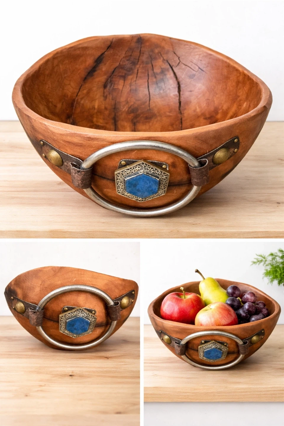 Beautifully handmade from solid walnut wood, this unique rustic bowl features natural grain patterns and decorative metal accents, making it a true statement piece for any home.