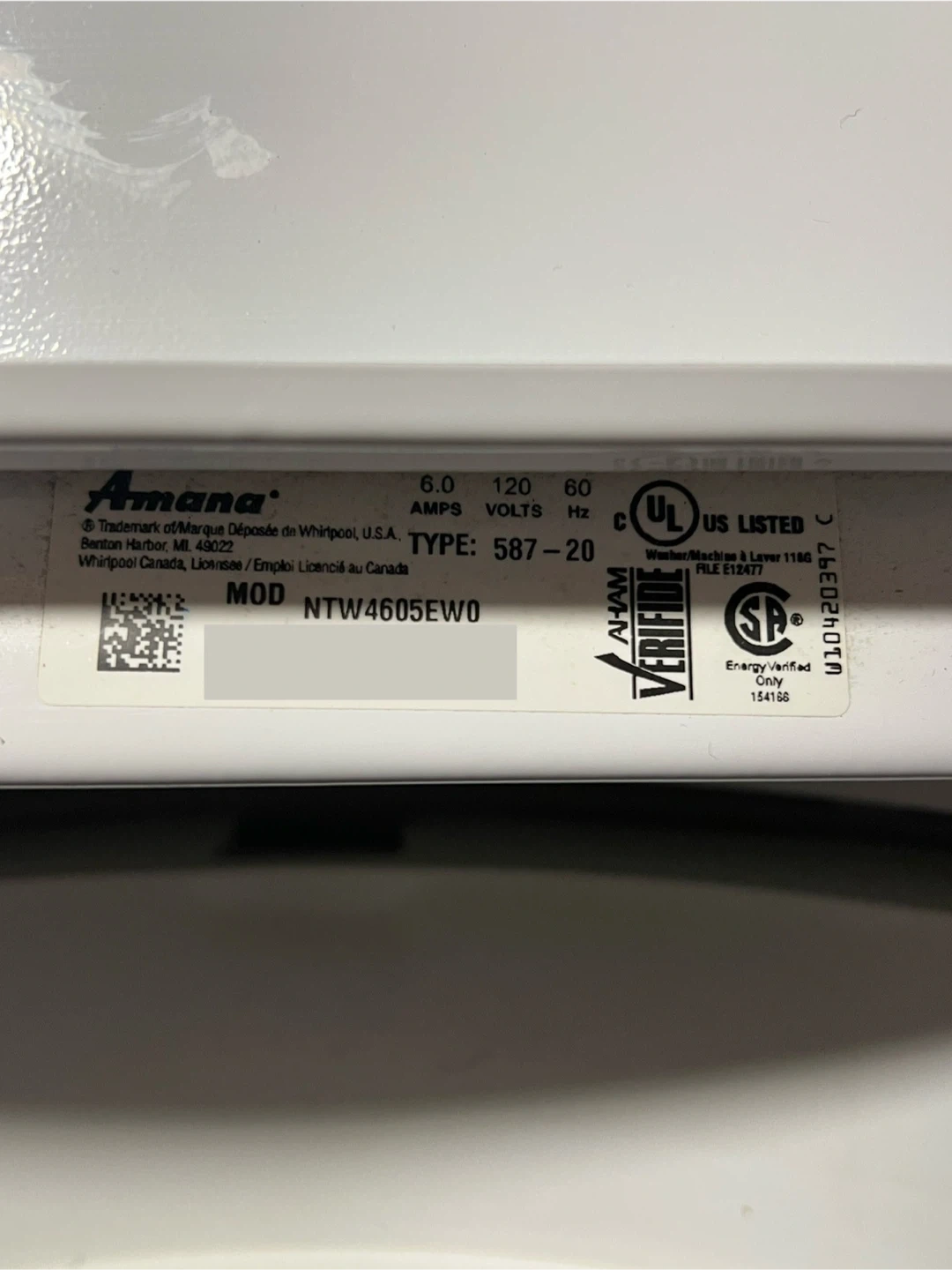 Washing machine model number is: