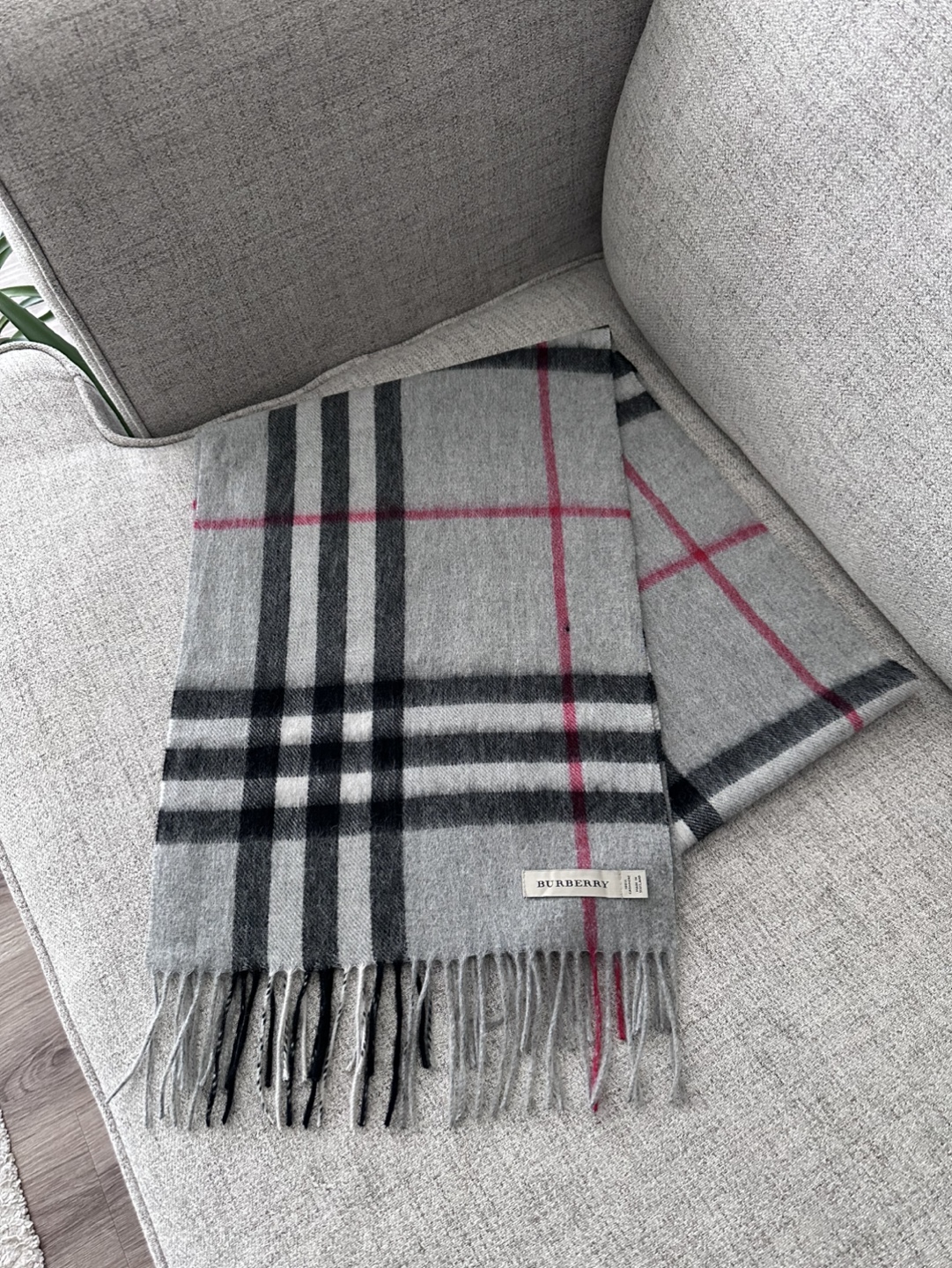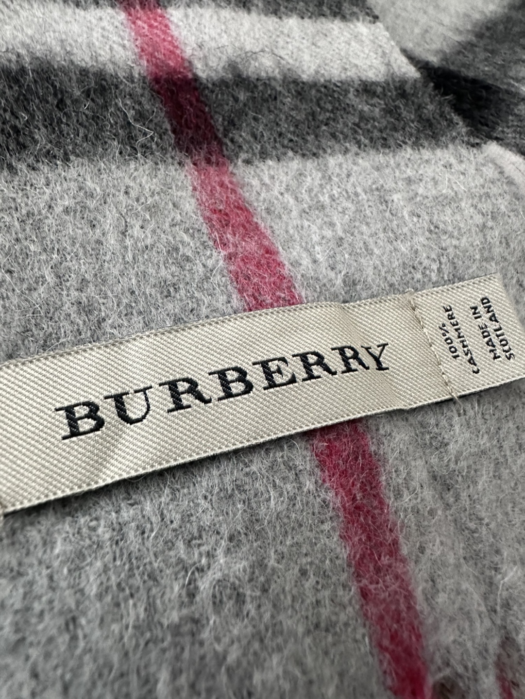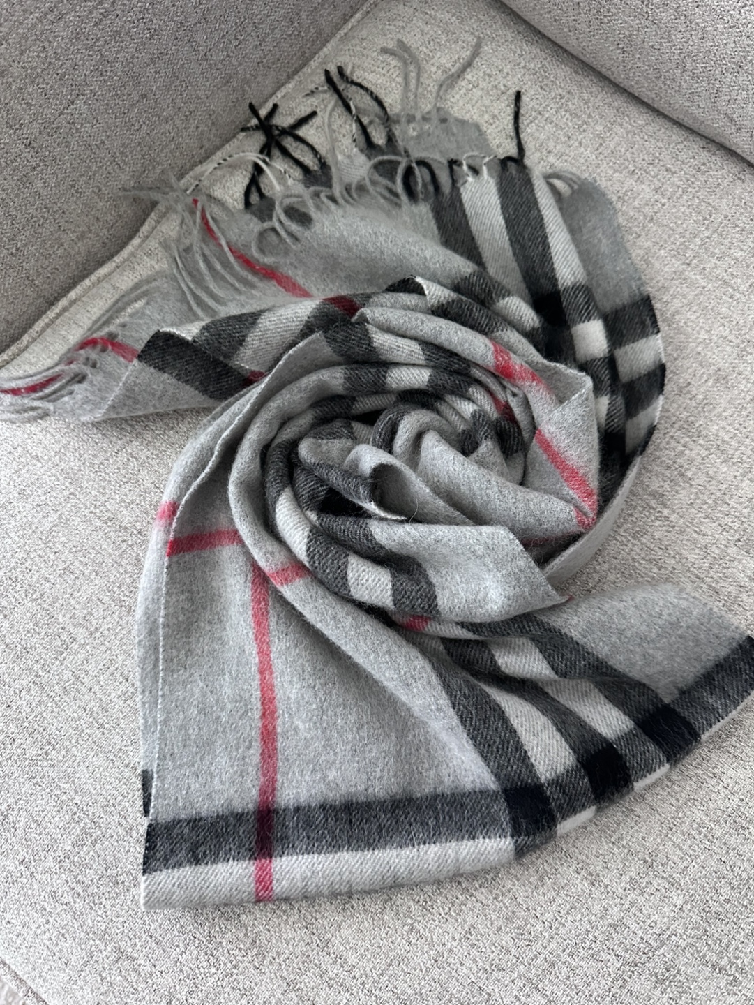 Authentic Burberry scarf. Grey and black check pattern with red accents. 100% cashmere. Made in Scotland. Features fringe detailing.