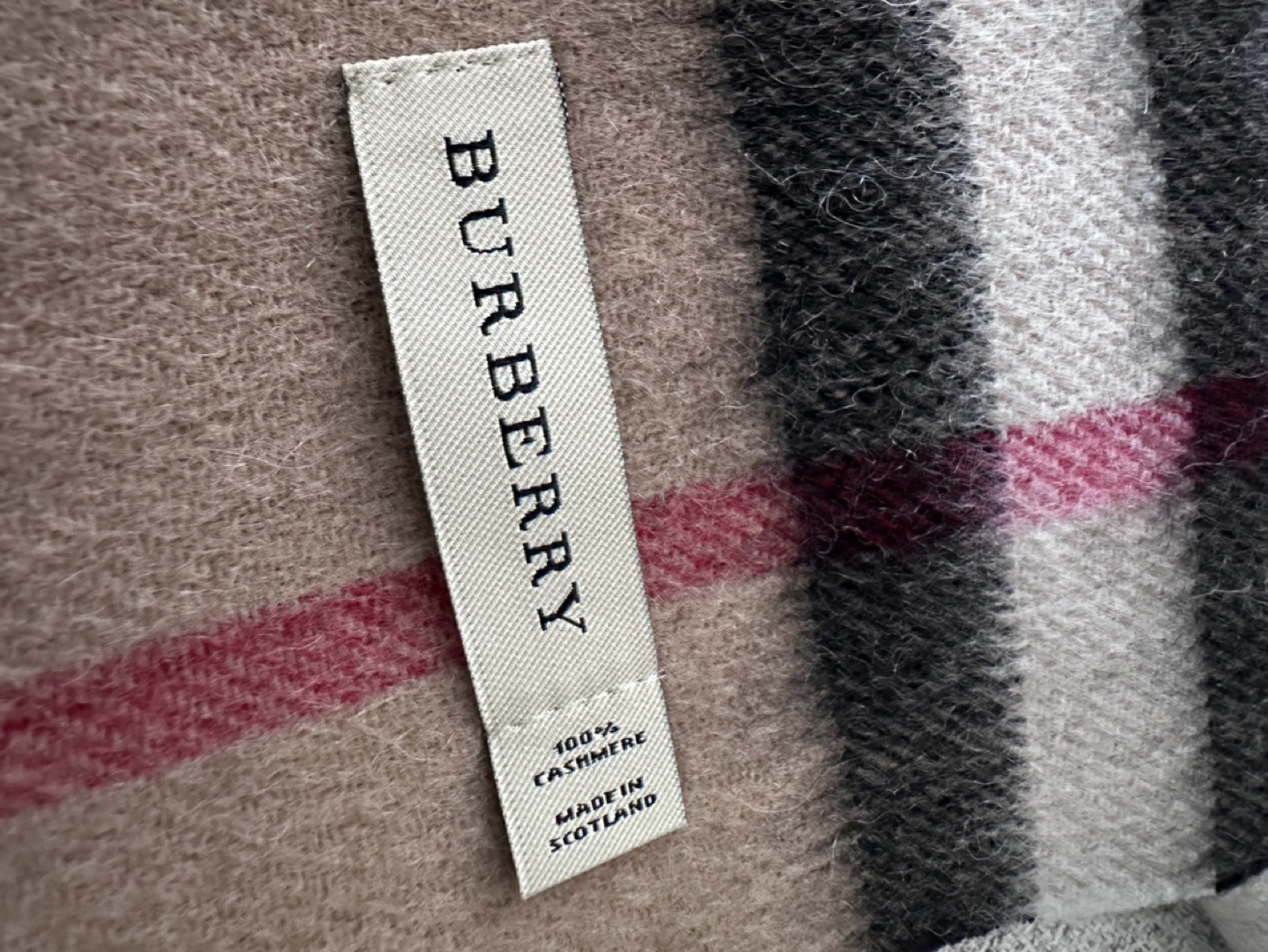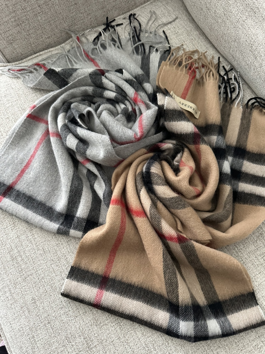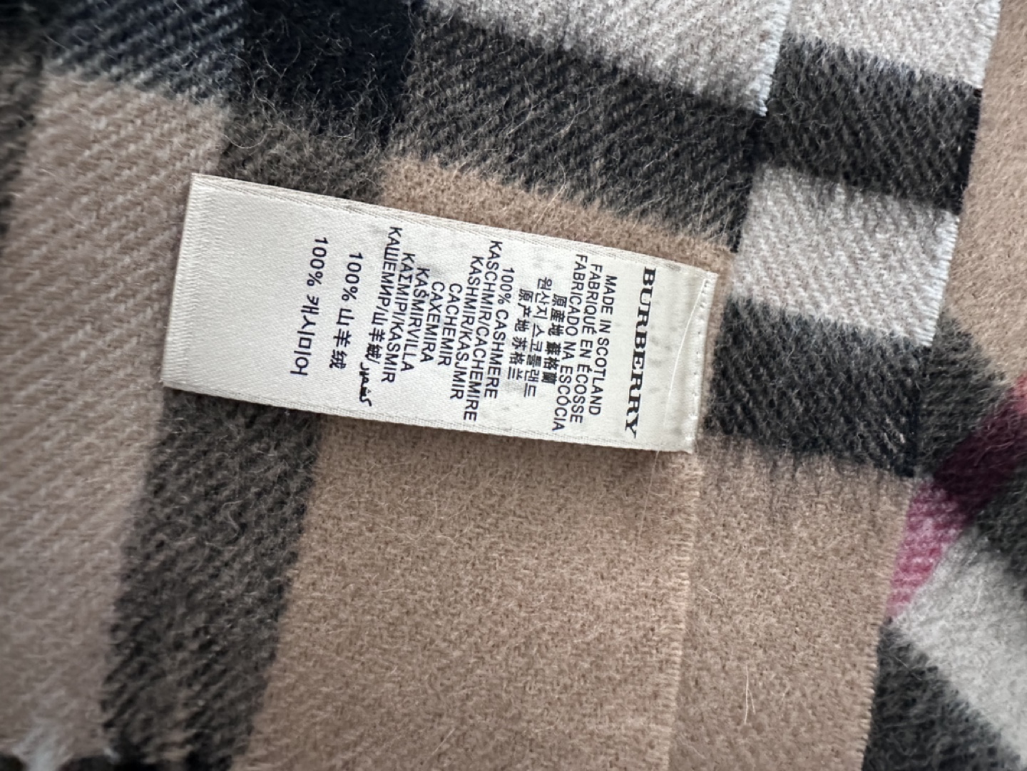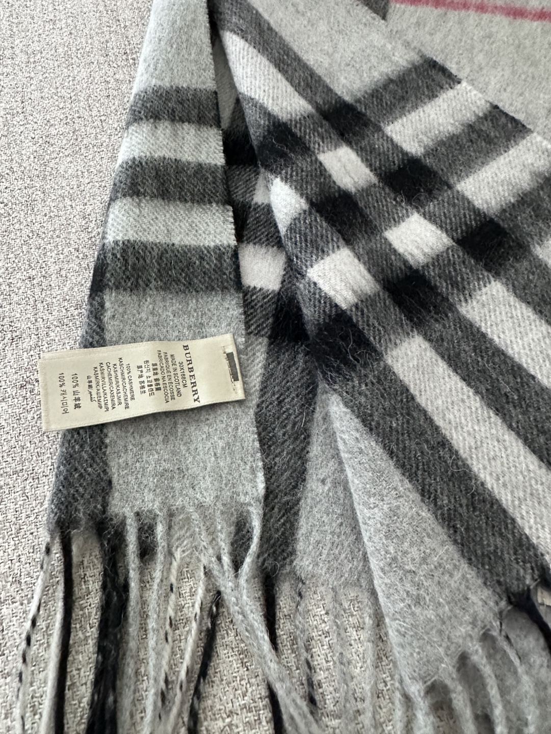 Authentic Burberry scarf. Grey and black check pattern with red accents. 100% cashmere. Made in Scotland. Features fringe detailing.