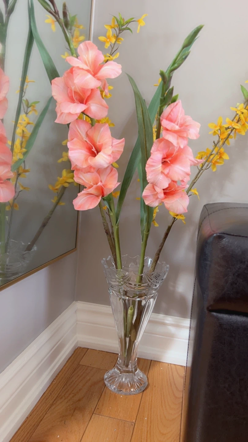 A lovely artificial floral arrangement featuring vibrant pink gladiolus and cheerful yellow forsythia. These beautiful faux flowers are displayed in a clear glass vase with a decorative rim. They add a touch of colour and elegance to any room, no assembly required!