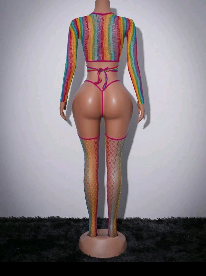 Colorful mesh lingerie set featuring a long-sleeved wrap top and matching thong. Includes fishnet stockings with rainbow stripes. Stretchy, sheer material. I have 260 of them I am selling them each one
