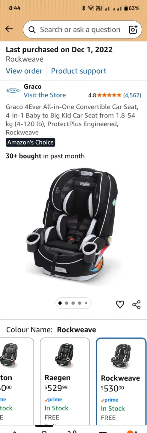 This Graco 4Ever car seat converts from a rear-facing harness to a forward-facing harness, and then to a high-back booster and backless booster. It's designed for children from 4-120 lbs. The seat includes two cup holders and is engineered with ProtectPlus.