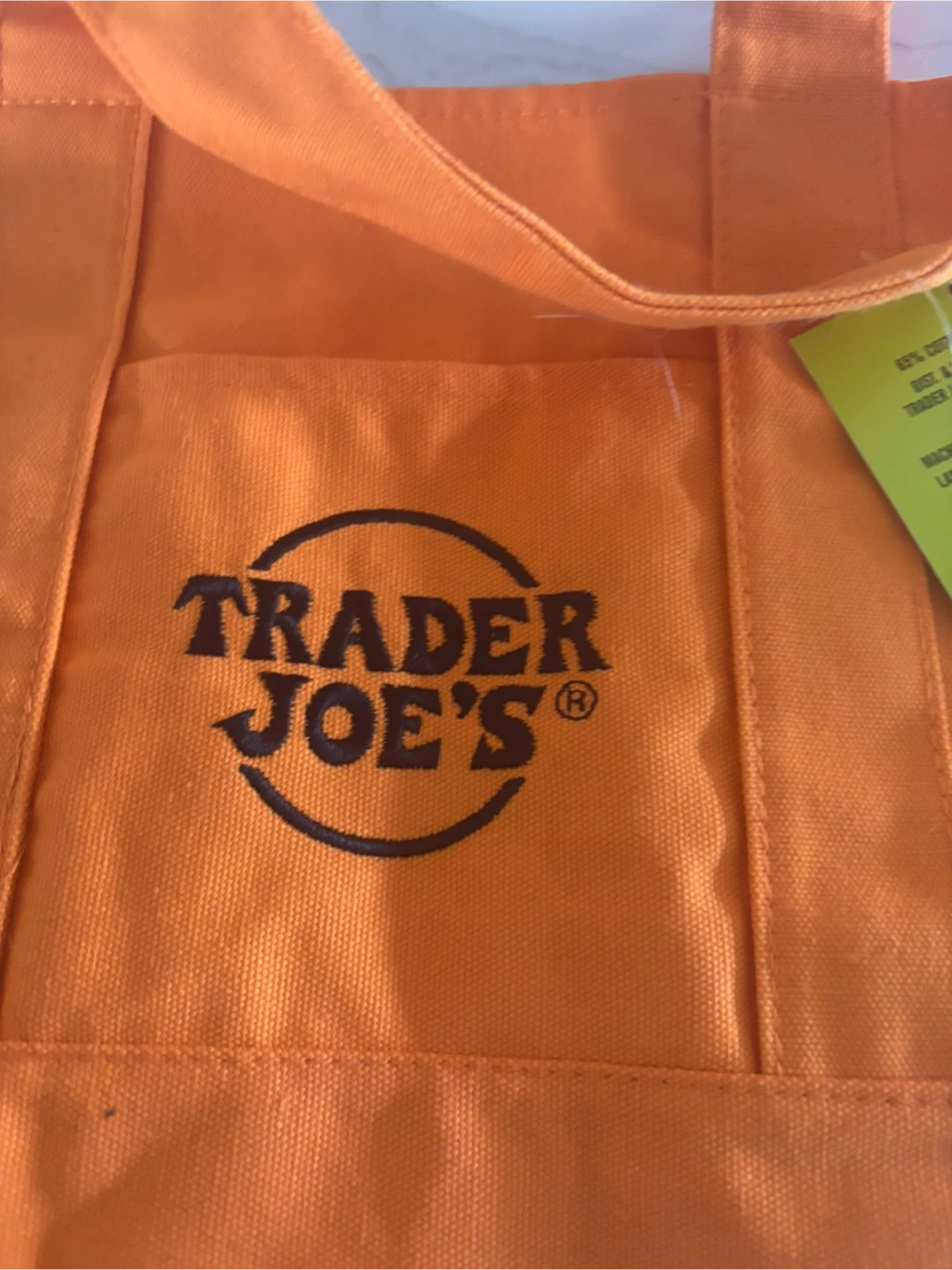 Orange canvas tote bag with Trader Joe's logo. Made of 65% cotton and 35% polyester. Machine wash cold with like colors; lay flat to dry. It'll shrink slightly if dried. Perfect for carrying treats!