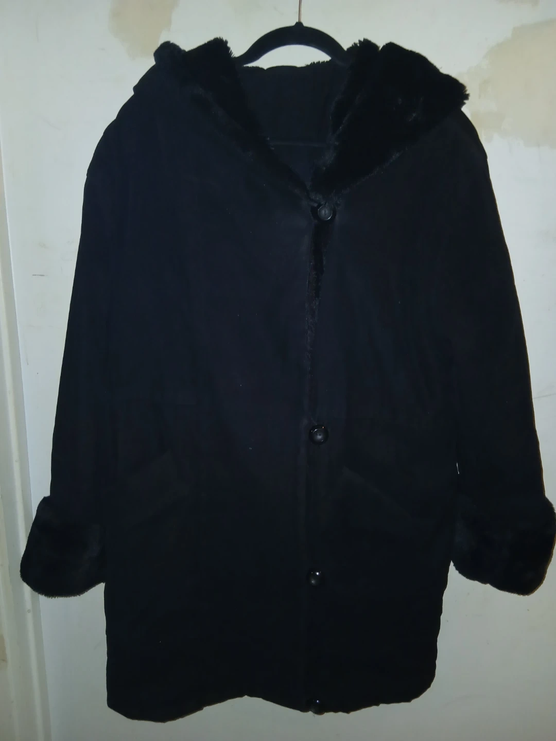 This very warm jacket is buttoned down with four large buttons and has two large pockets the hood has soft lining.