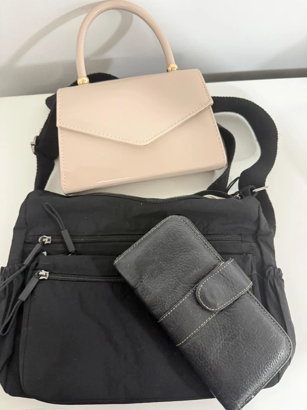 Selling a collection of handbags and a wallet. There's a small, shiny, light beige handbag with a handle, a black shoulder bag, and a black leather wallet. They are all in used condition.