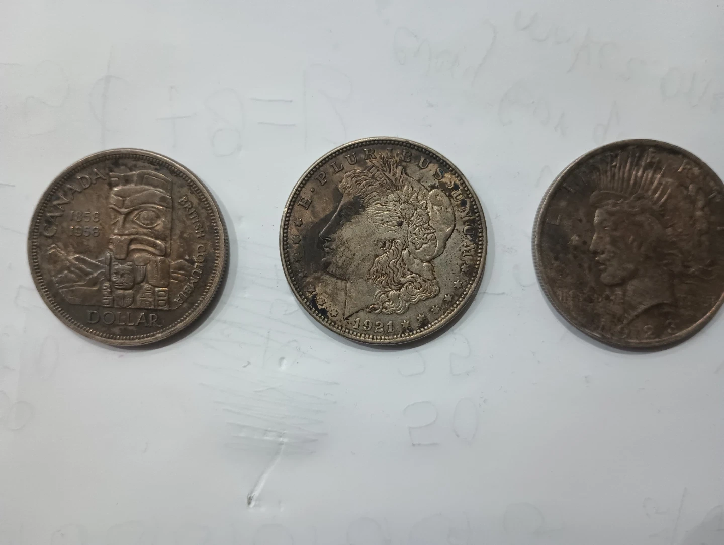 Buy & SellVintage Coins: Canadian Dollar, Morgan Dollar, Peace DollarVintage Coins: Canadian Dollar, Morgan Dollar, Peace Dollar$95This lot includes a 1958 Canada British Columbia Dollar coin, a 1921 Morgan Dollar, and a 1923 Peace Dollar. These coins have a distinct, aged patina. WHERE TO MEETMaple AveView MapSELLERverifiedkeronDowntown Brampton953 reviews0 chats·1 favorites·14 viewsSEND CHAT TO SELLERHi keron! I’m interested in your listing.Hi keron! I’m interested in your listing.Get the Karrot app to chatSign In to chat