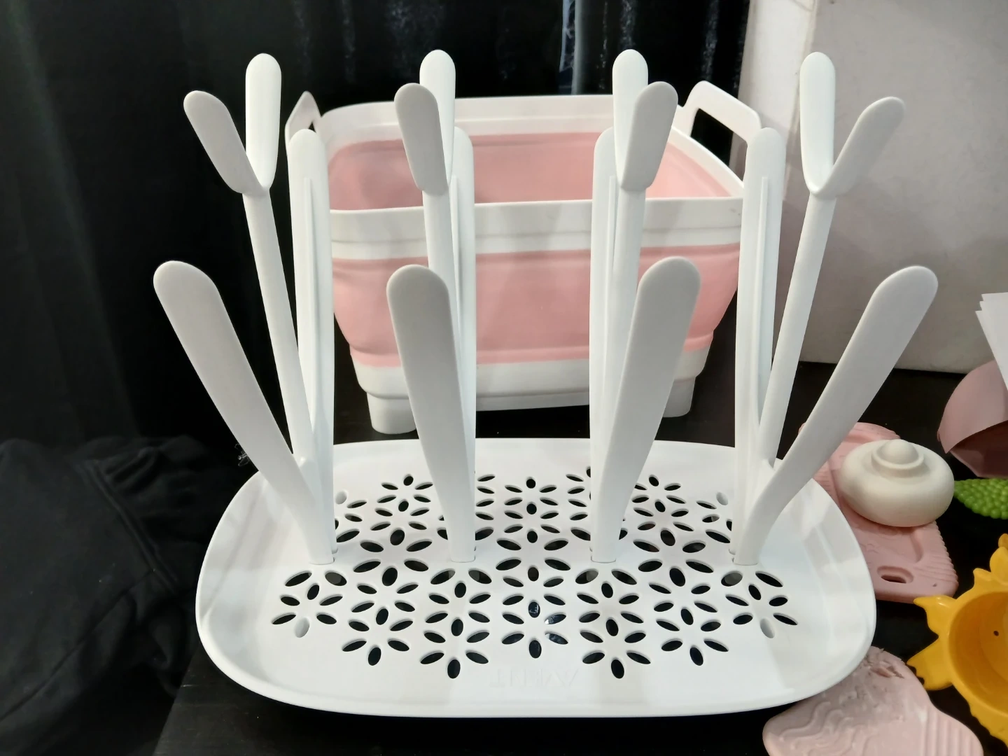 This is a white drying rack for baby bottles and accessories. It has many prongs for holding items and a perforated base for drainage. The rack's design is simple and functional for everyday use. Used once.