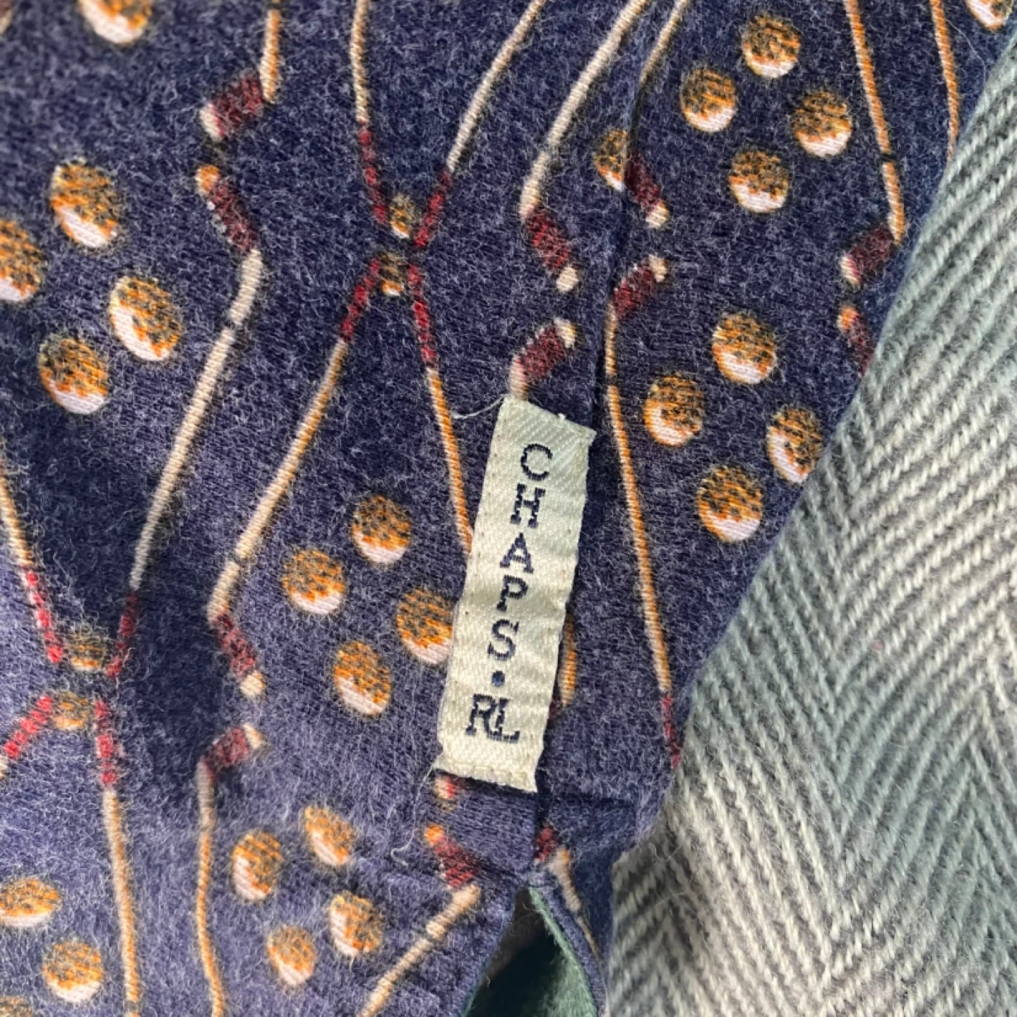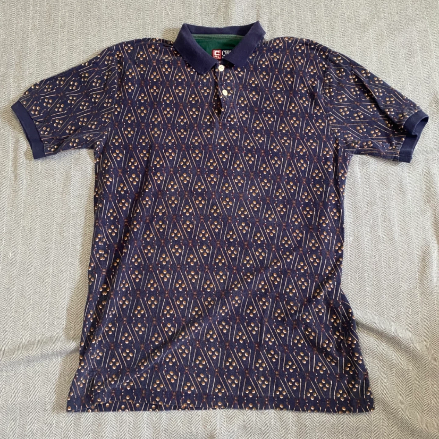 Vintage Chaps Ralph Lauren short-sleeve polo shirt. 100% cotton material. Made in the Philippines. Features a repeating pattern.
