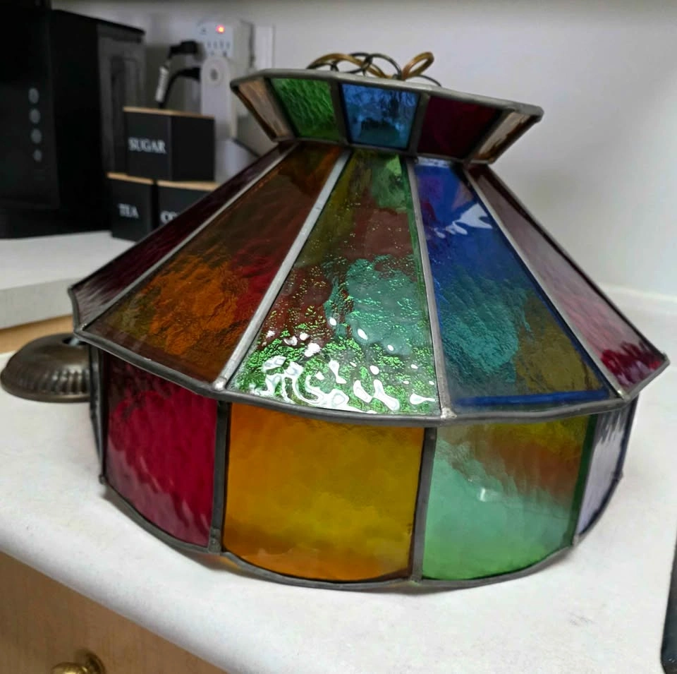 Beautiful Tiffany-style stained glass ceiling lamp featuring vibrant panels of textured red, blue, green, and amber glass. Octagonal shape with a single-bulb fixture inside. Comes complete with the matching brass/antique-finish ceiling canopy, hanging chain, and wiring. Perfect vintage condition. No cracks, chips, or damage to any of the glass panels. Open to all reasonable offers. Pick up only (contactless available).