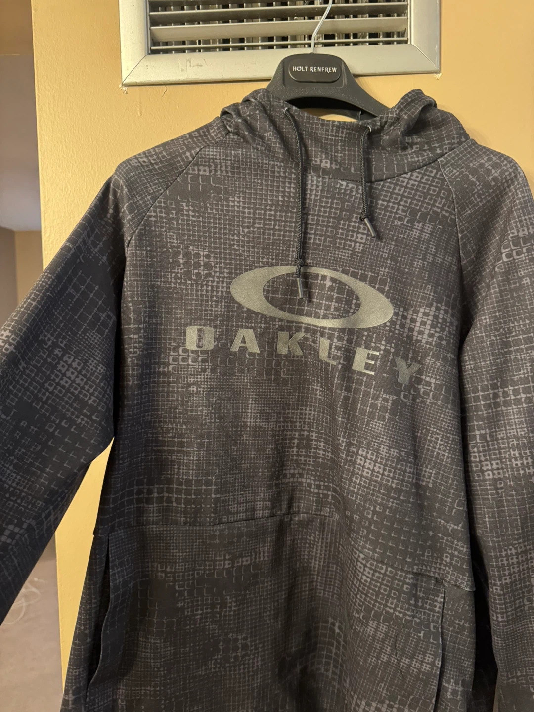 Selling an Oakley pullover hoodie! XL It features the Oakley logo on the front and has a cool patterned design throughout. Perfect for staying cozy and stylish!