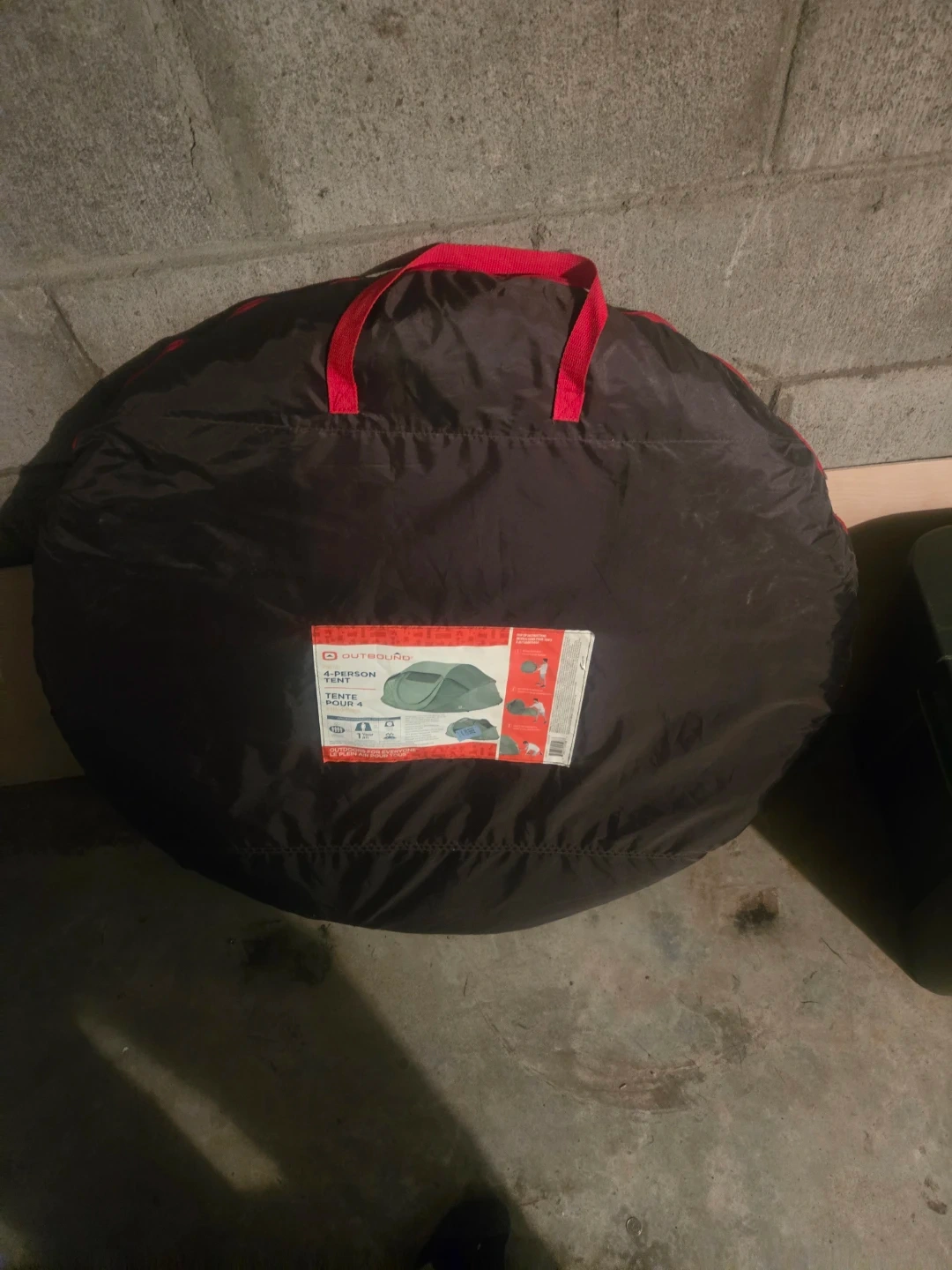 Outbound pop up 4-person tent. Easy set up with instant frame system. Water-resistant 600mm coated fabric, rain fly and zipper rain cover. Features double layer doors with window for ventilation and bug protection. Includes tent, stakes, guy lines, bag and instructions. Some tent pegs are bent