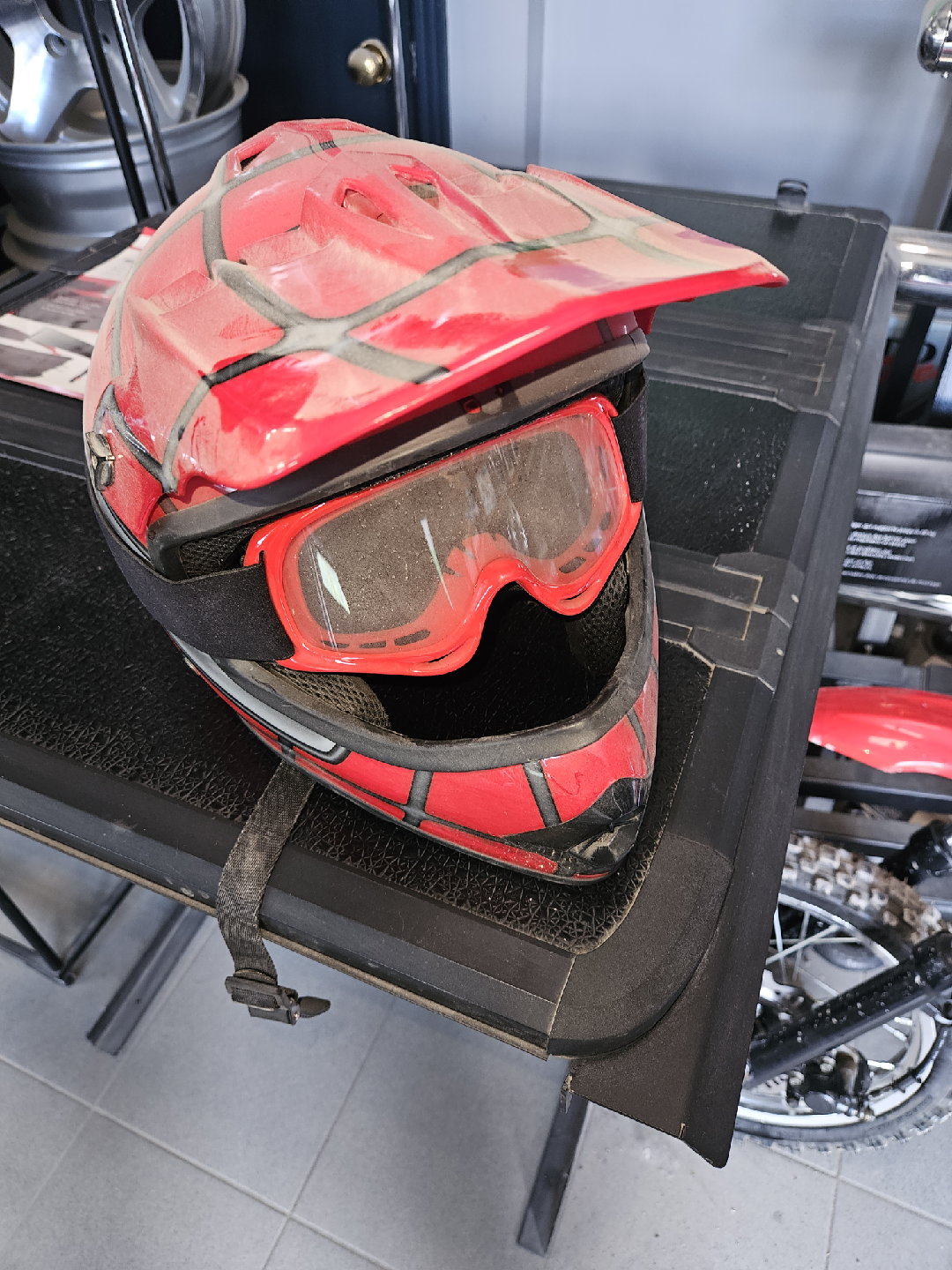 Red dirt bike helmet with goggles. Looks like it's been used but still has plenty of life left!