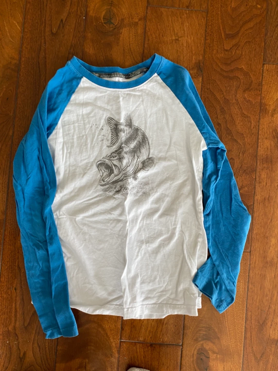 This is a long-sleeve t-shirt with a graphic of a bass fish. It features contrasting blue sleeves and a white body. The material is soft cotton blend.