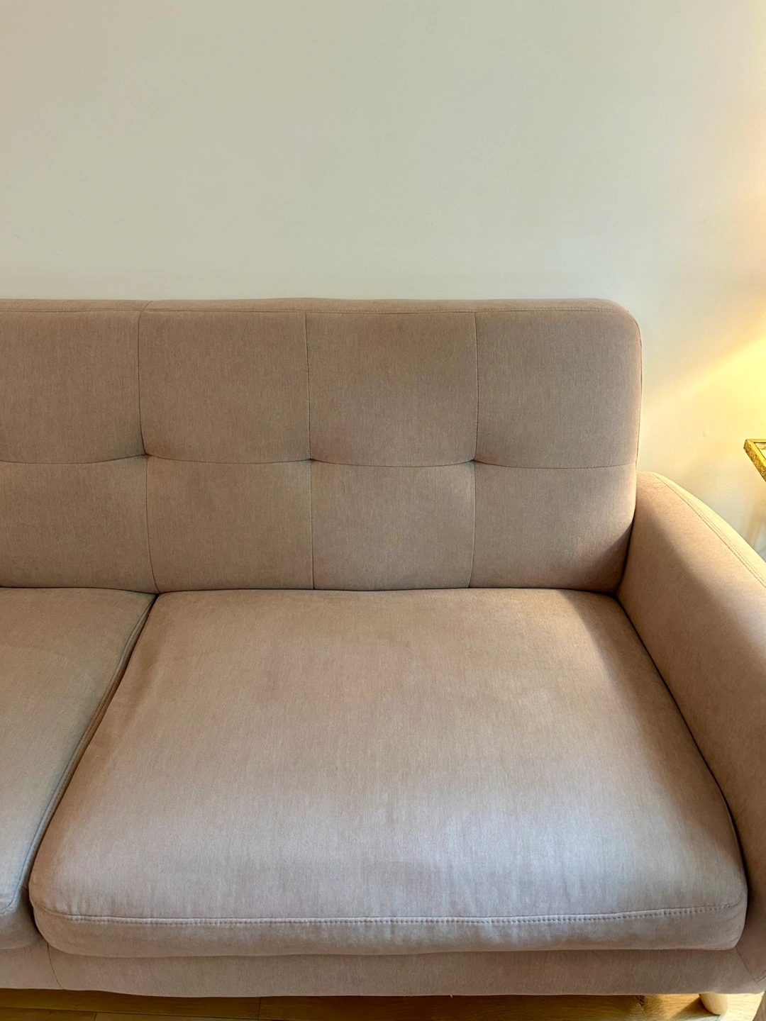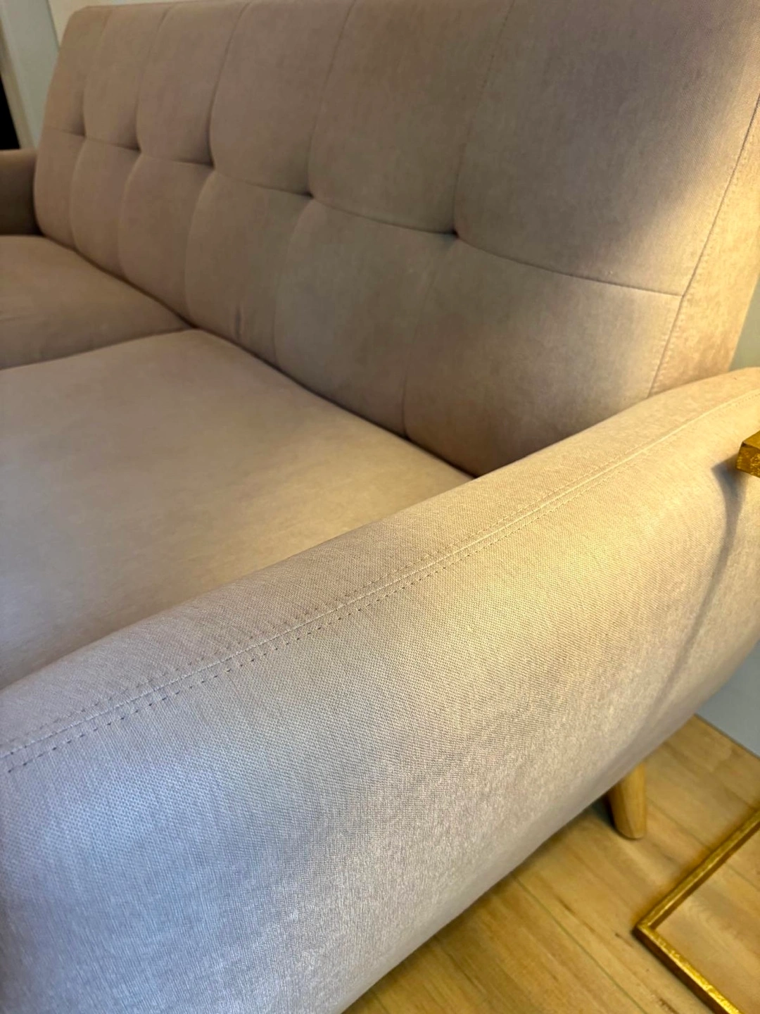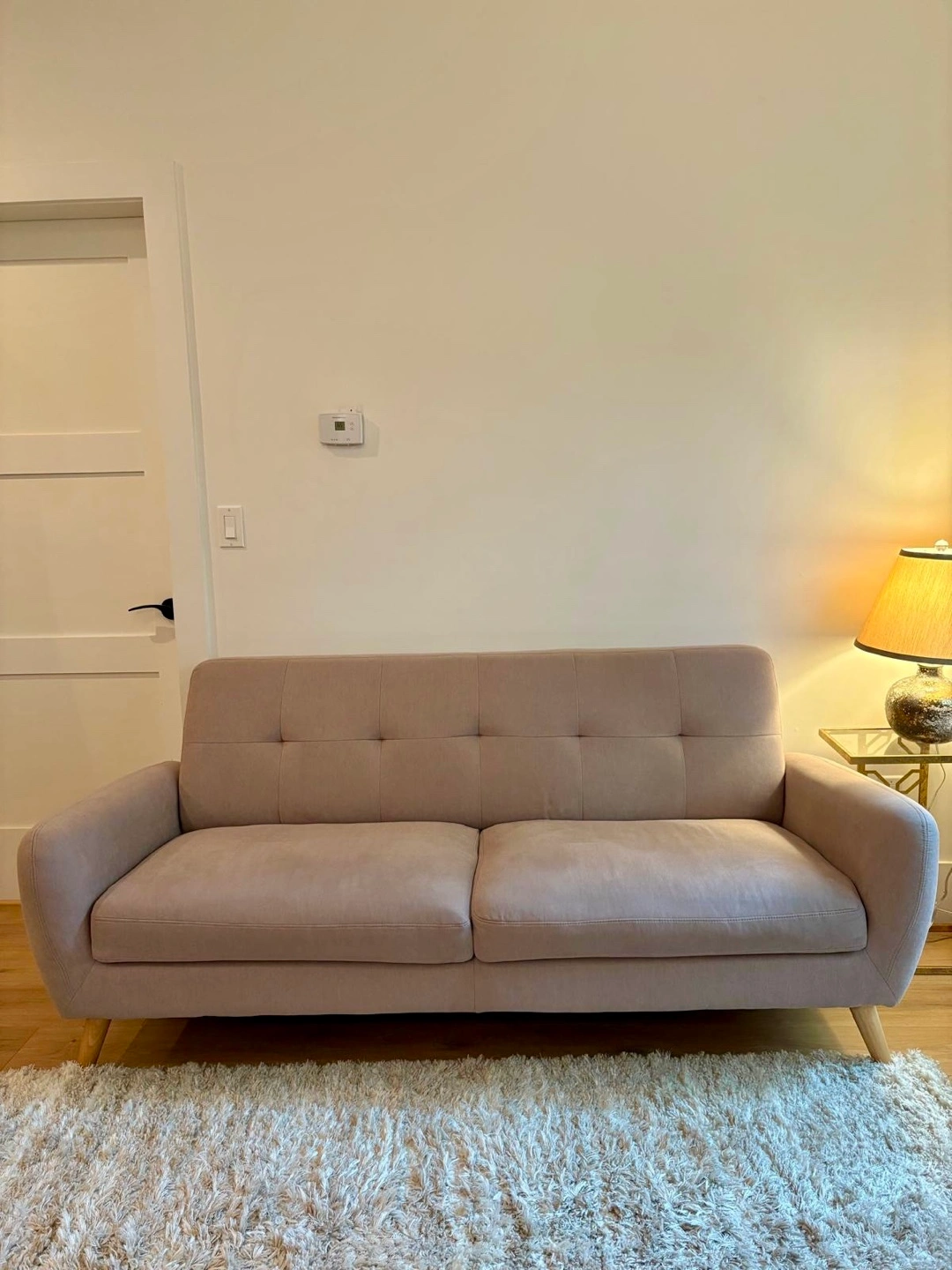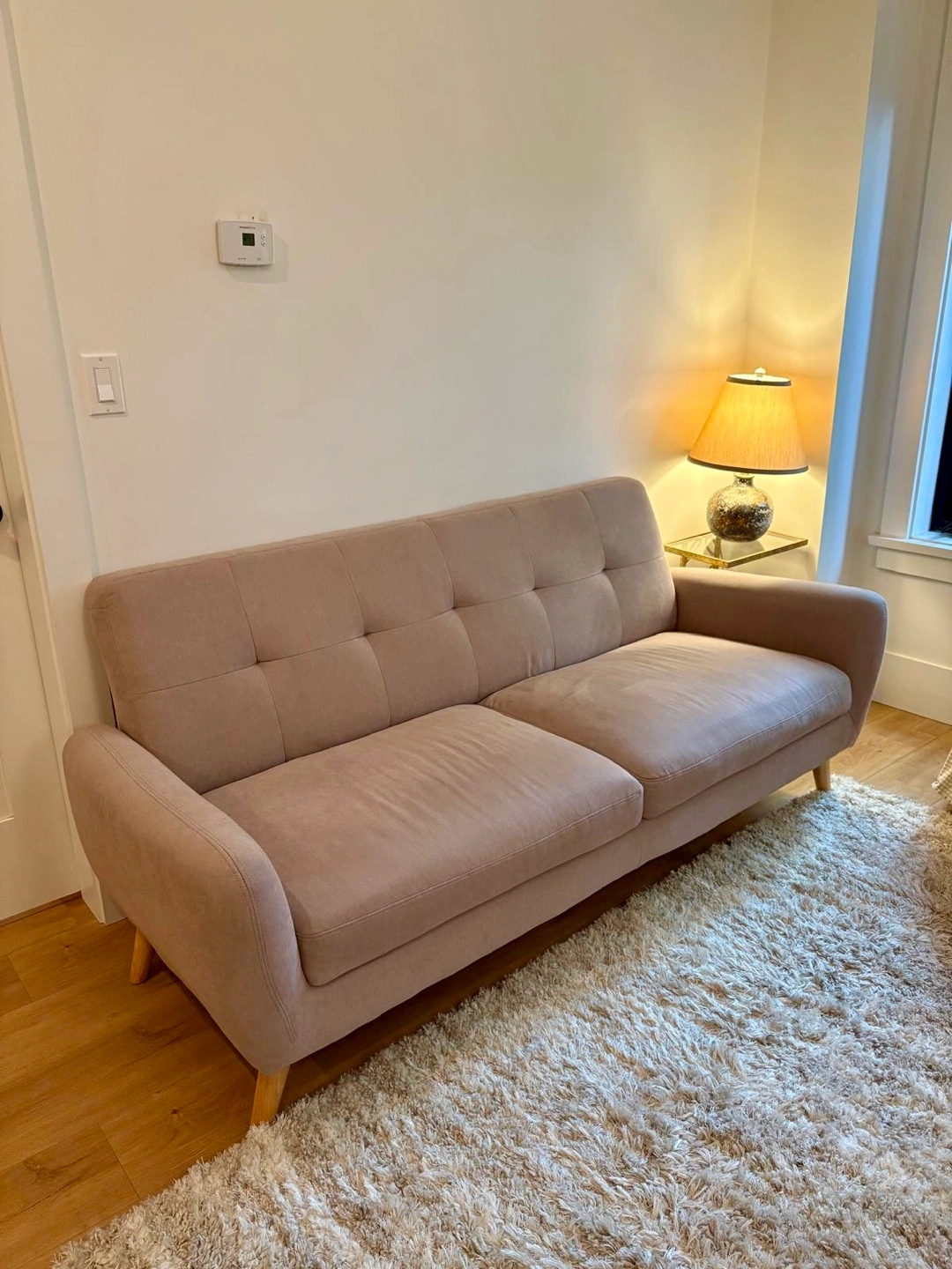 Stylish blush pink sofa with wooden legs. Mid-century modern design. Slight wear on corners (shown in photos) but no rips or stains. Purchased from Structube. Pick up in Riley Park