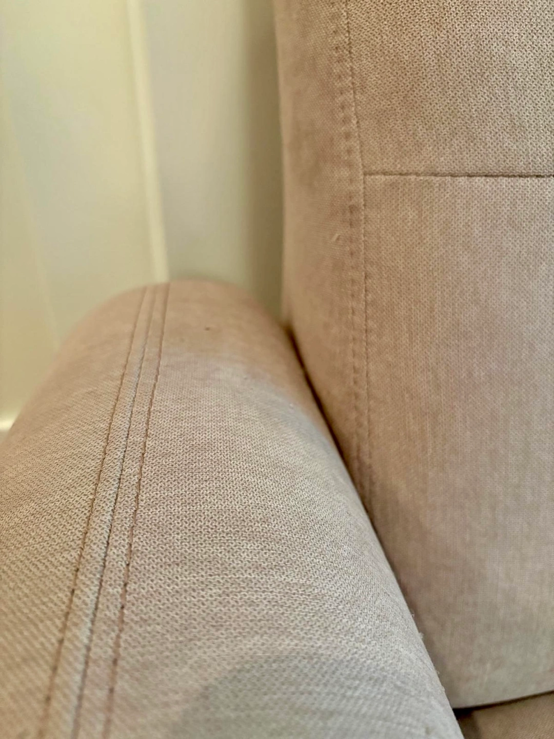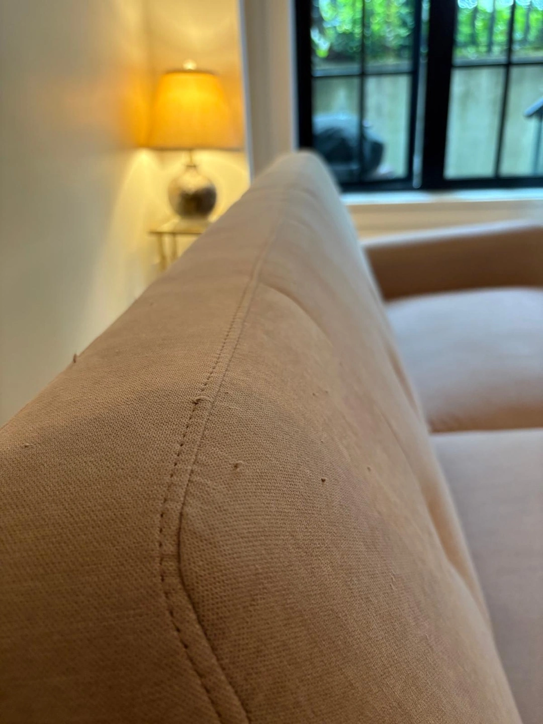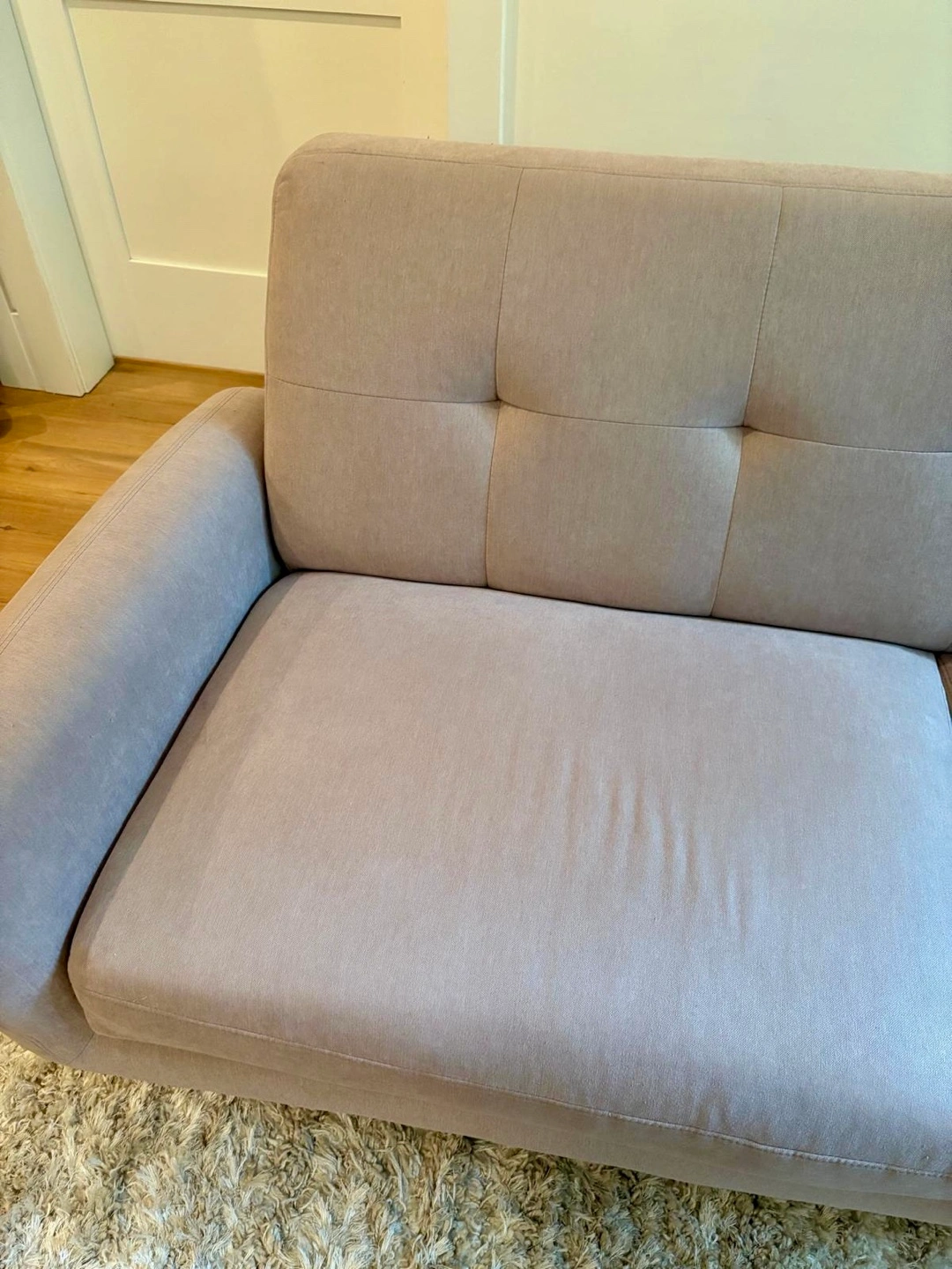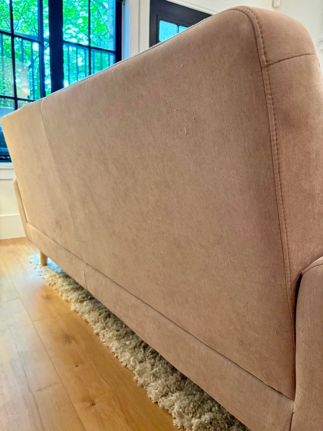 Stylish blush pink sofa with wooden legs. Mid-century modern design. Slight wear on corners (shown in photos) but no rips or stains. Purchased from Structube. Pick up in Riley Park
