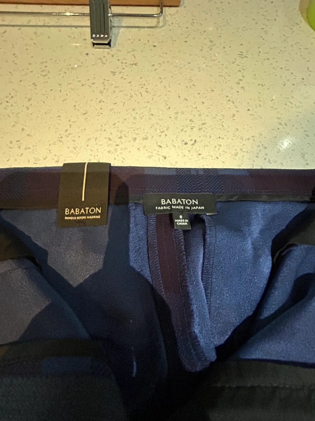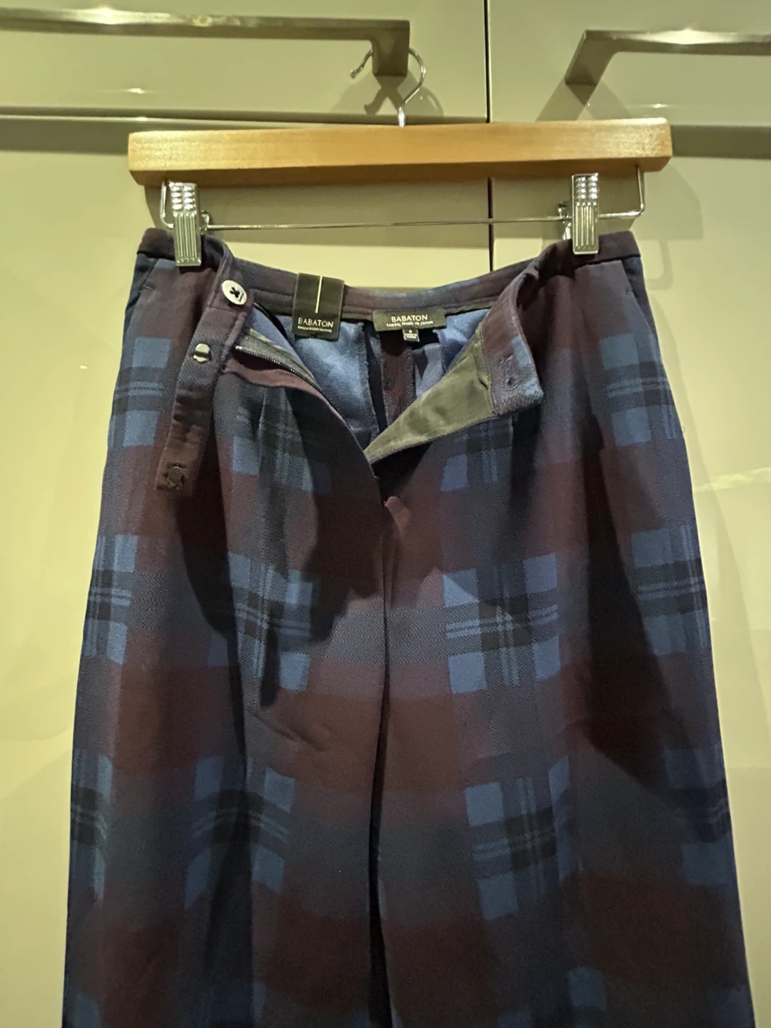 Babaton Elton trousers feature a classic plaid pattern in blue and burgundy.