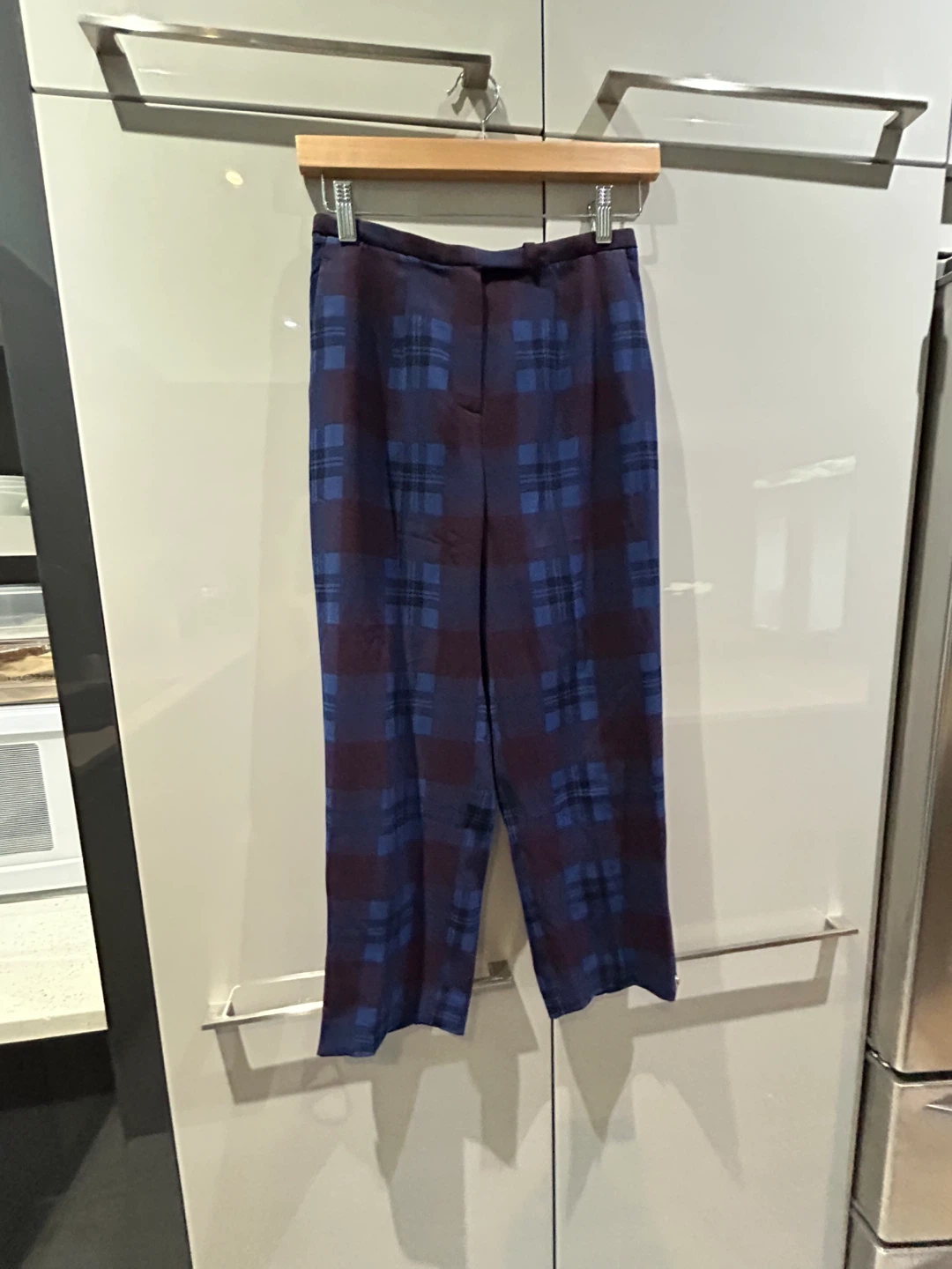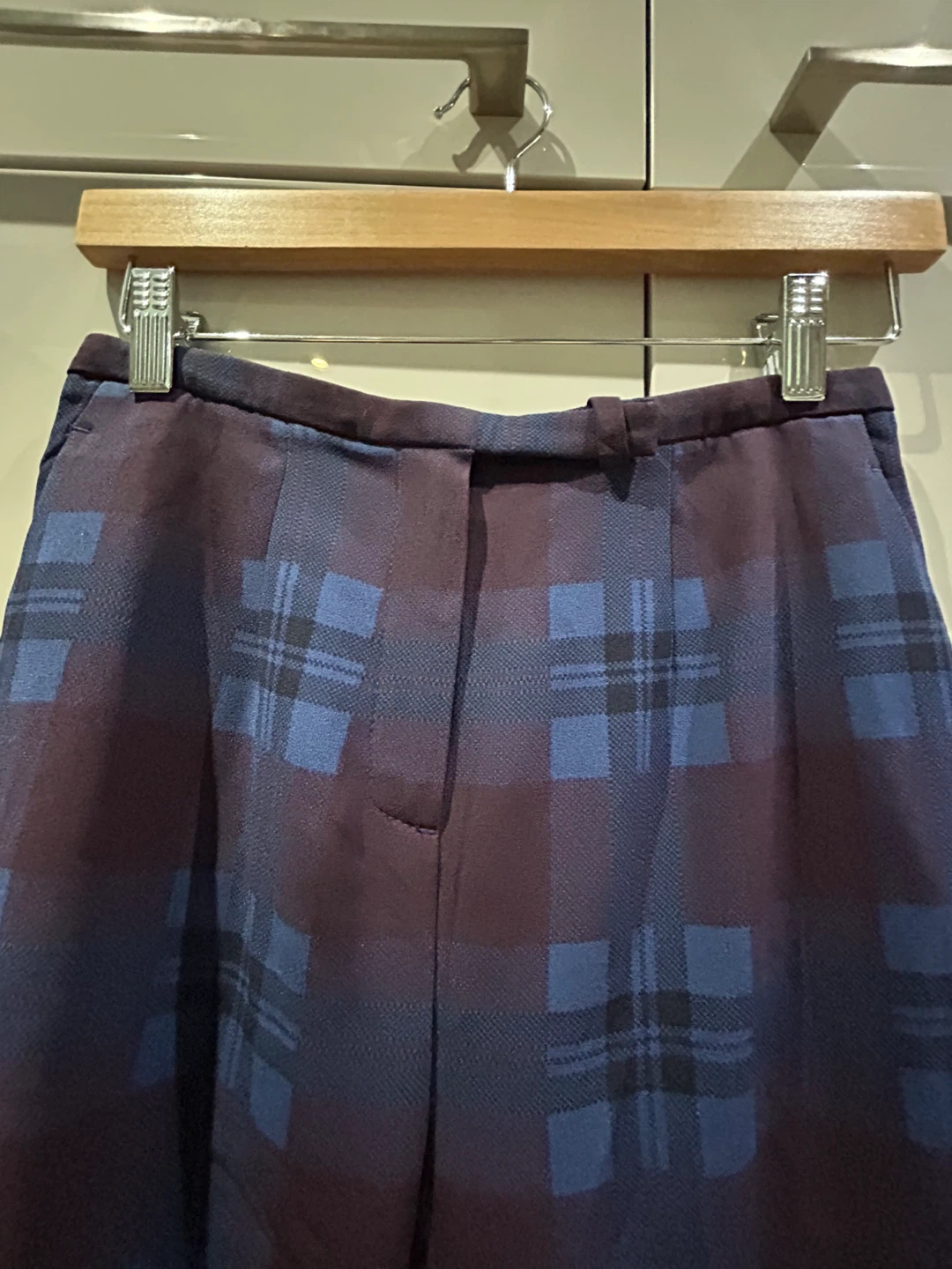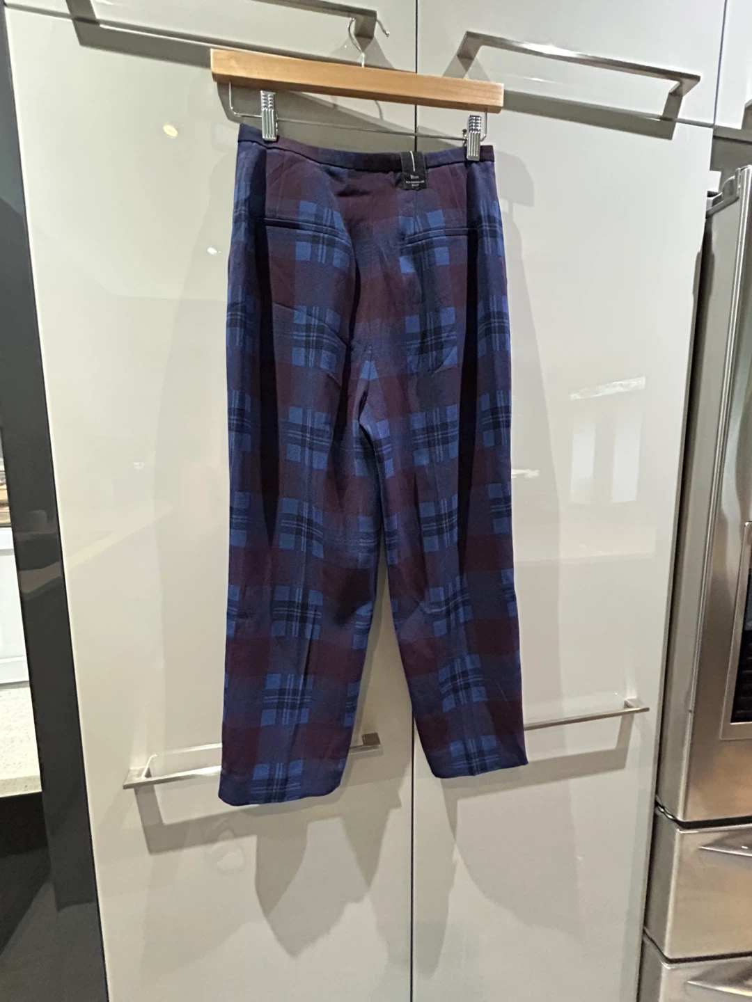 Babaton Elton trousers feature a classic plaid pattern in blue and burgundy.
