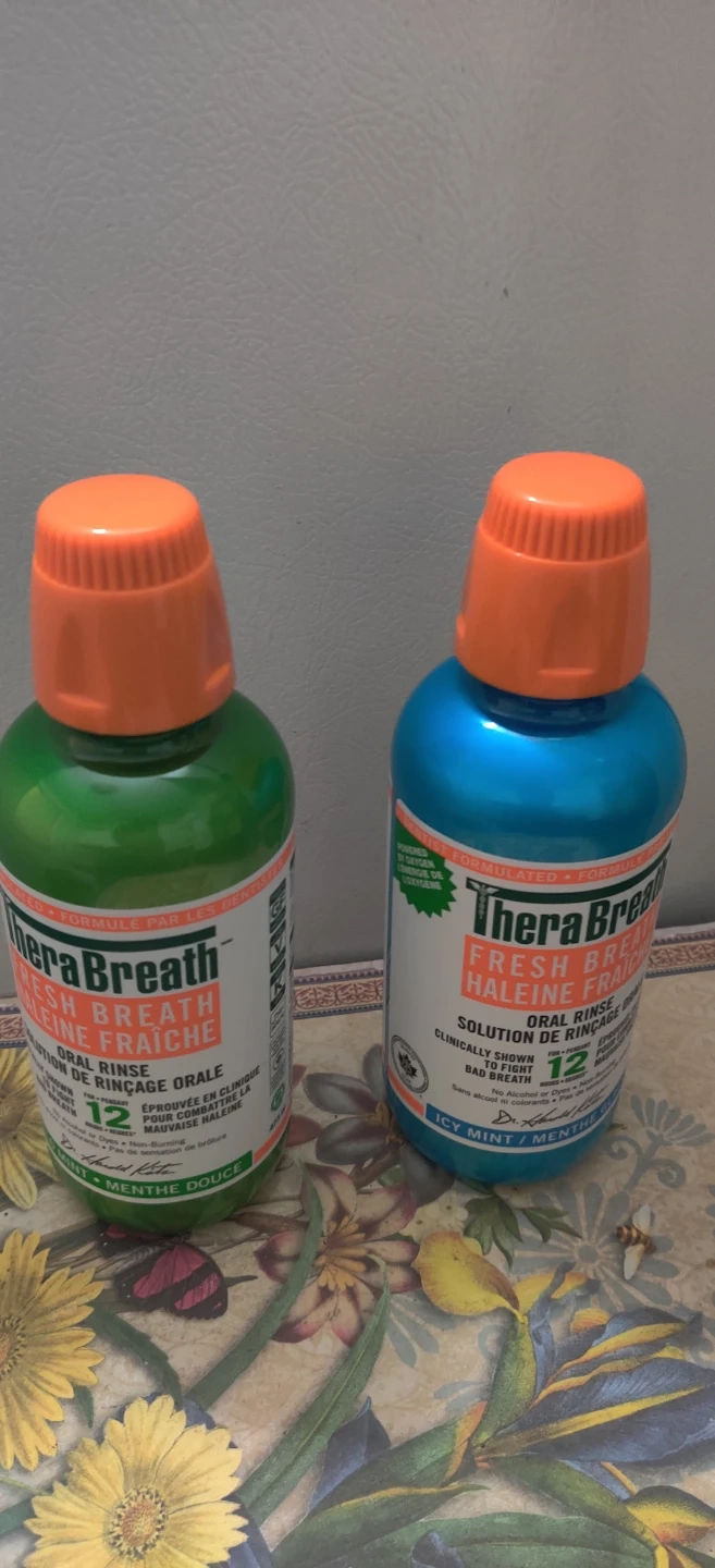 Selling two bottles of TheraBreath Oral Rinse! One is Mild Mint and the other is Icy Mint. Both are 473 ml and help fight bad breath for up to 12 hours. They're alcohol and dye-free, and non-burning too!