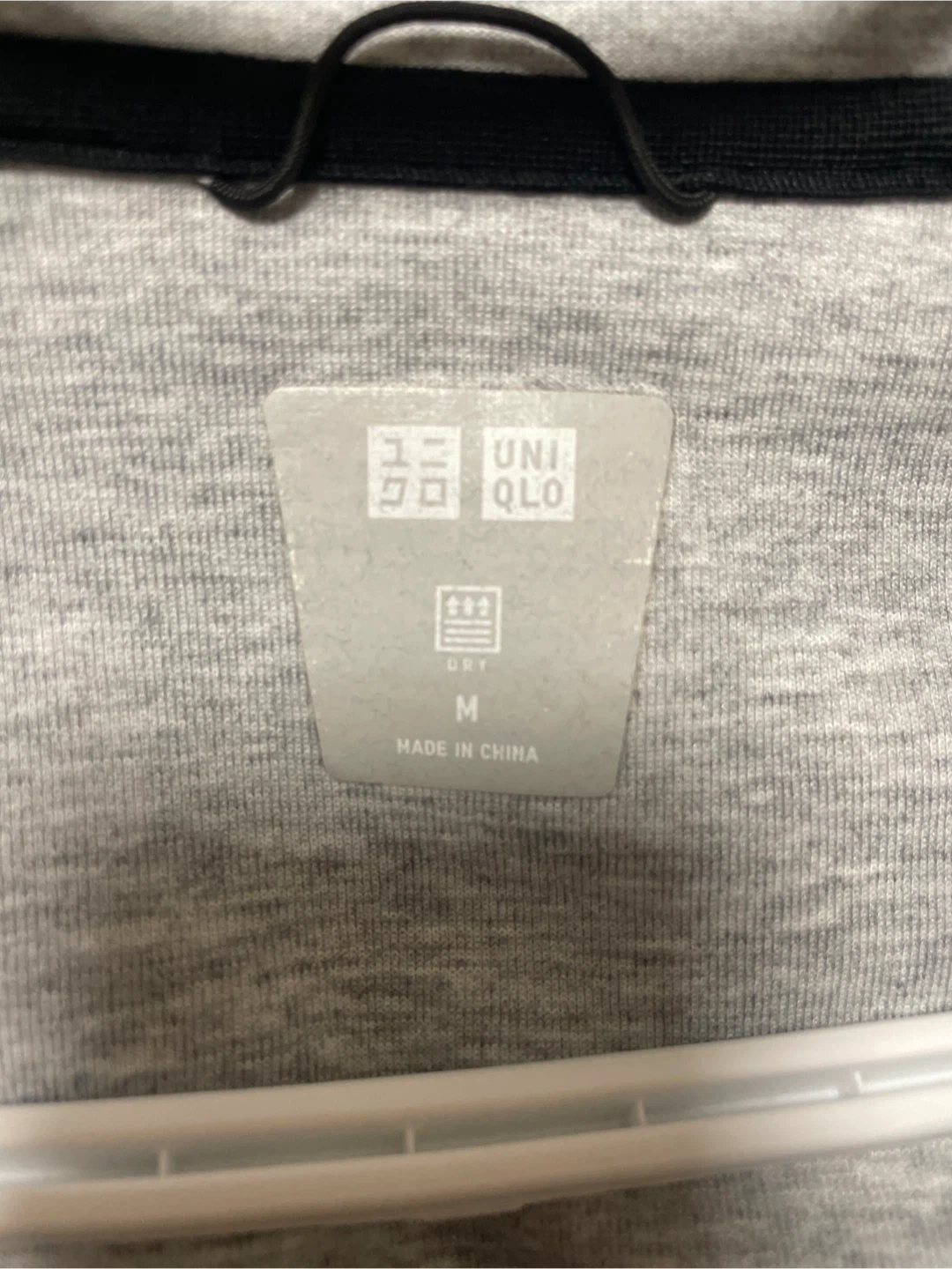 This is a Uniqlo grey full-zip hoodie. It's a size medium and features a chest pocket with a zipper. The fabric is lightweight and breathable.