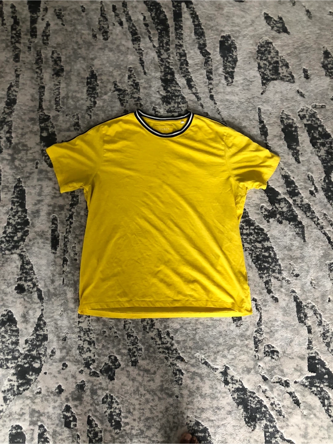 This is a vibrant yellow t-shirt from Guess Denim. It features the "Guess Denim" logo tape along the sleeves and neckline trim. It's made of comfortable fabric.