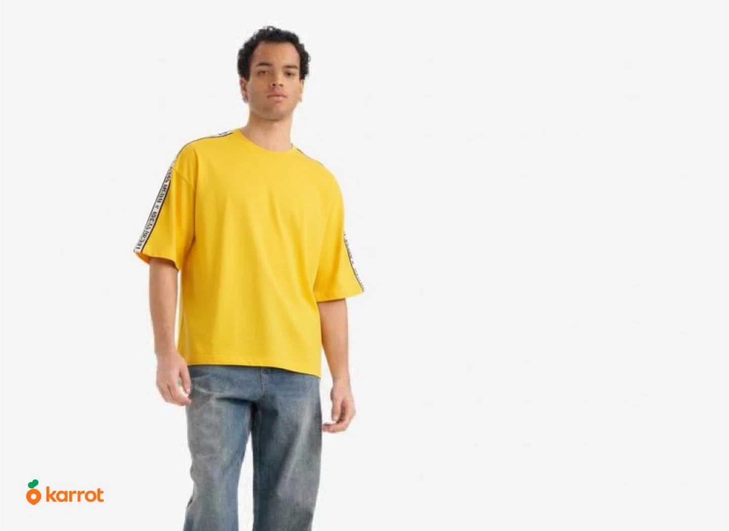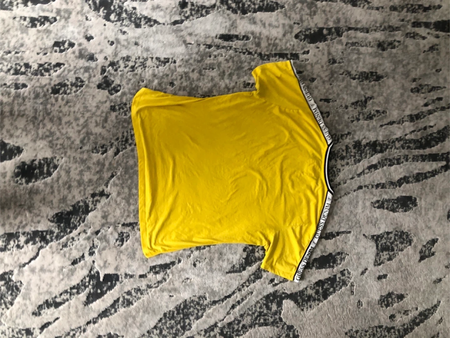 This is a vibrant yellow t-shirt from Guess Denim. It features the "Guess Denim" logo tape along the sleeves and neckline trim. It's made of comfortable fabric.