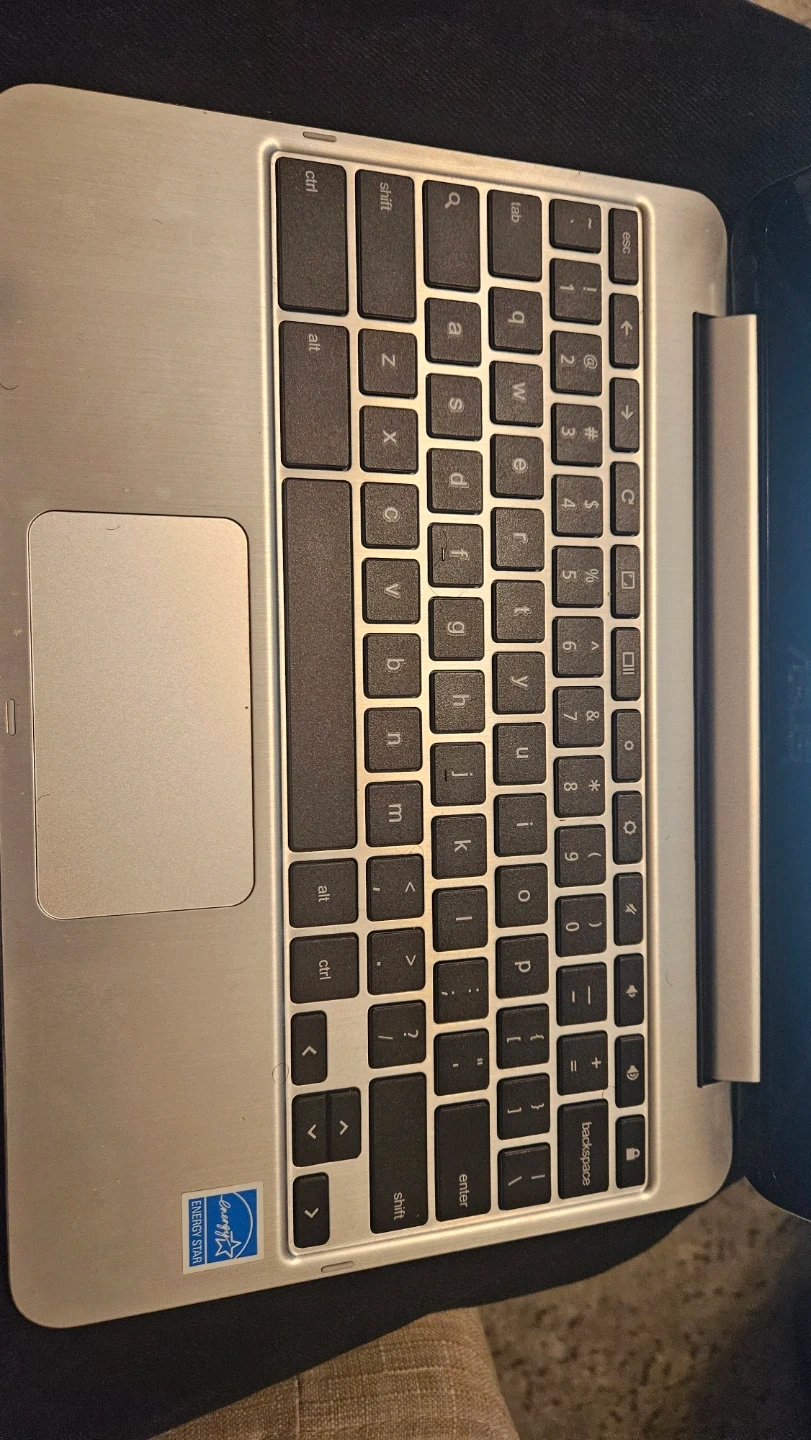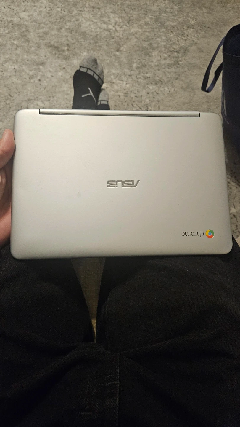 Selling a used ASUS Touchscreen Chromebook in silver. It's a lightweight and portable laptop perfect for everyday tasks and browsing. Great for students or anyone needing a simple, reliable device on the go! Original charger included.