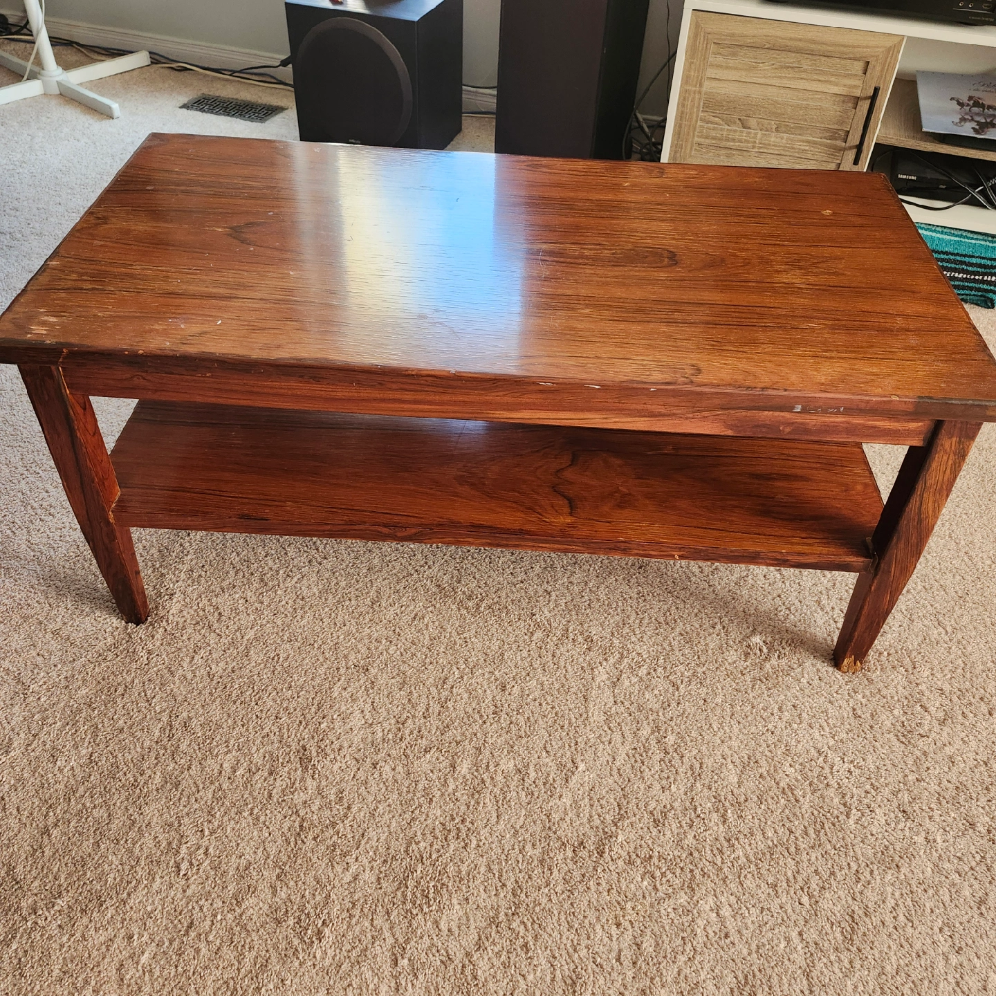 Vintage coffee table and two side tables. All tables are solid wood and show some wear. Deep brown grainny table top finish. being sold as a set only.