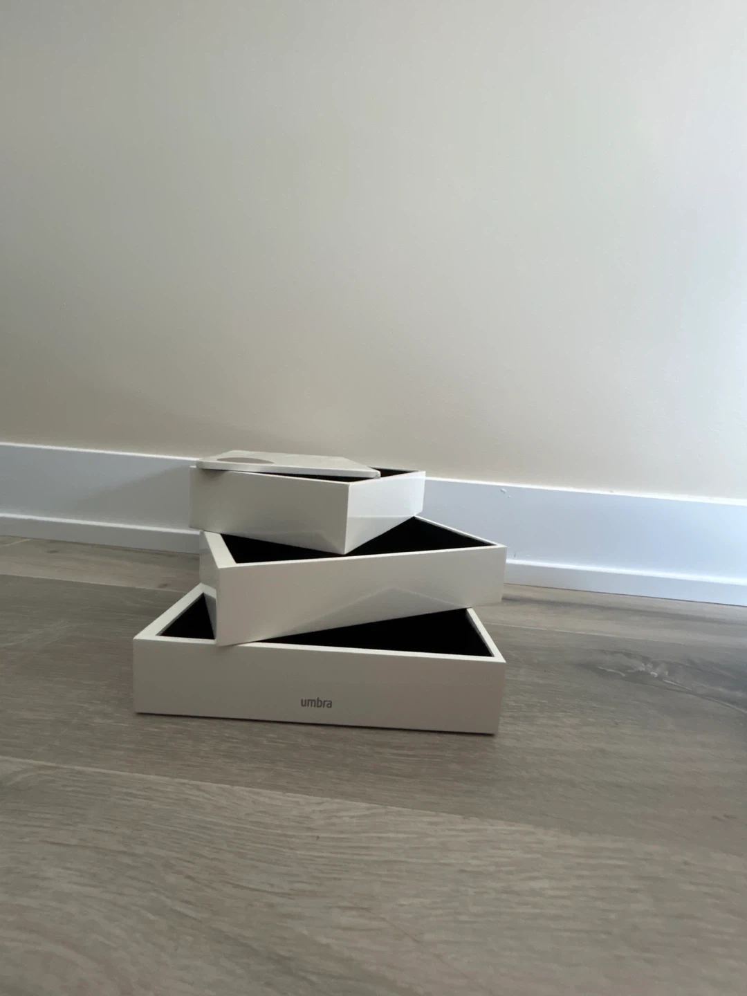 Selling an Umbra Stowit storage box in a sleek white and black colour scheme! This stylish box is perfect for keeping your small items organized and out of sight. It's in great condition and comes with the original box, so it's ready to use right away
