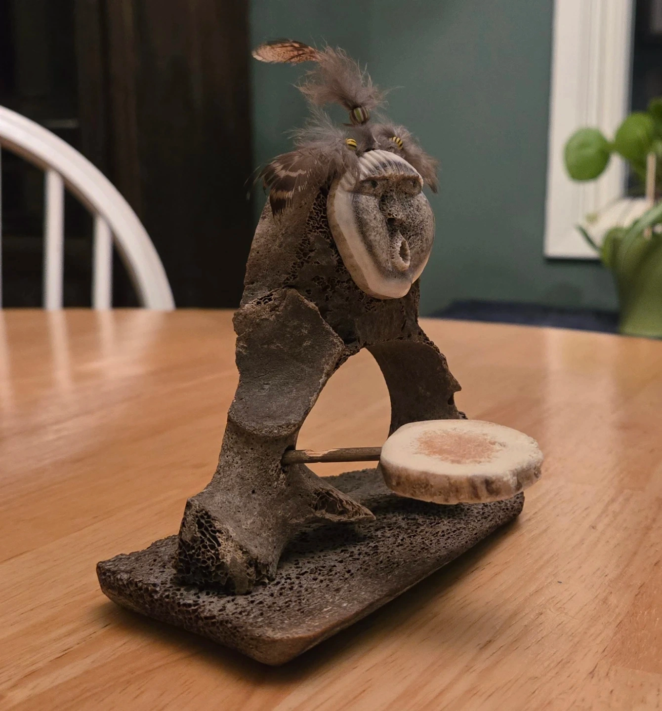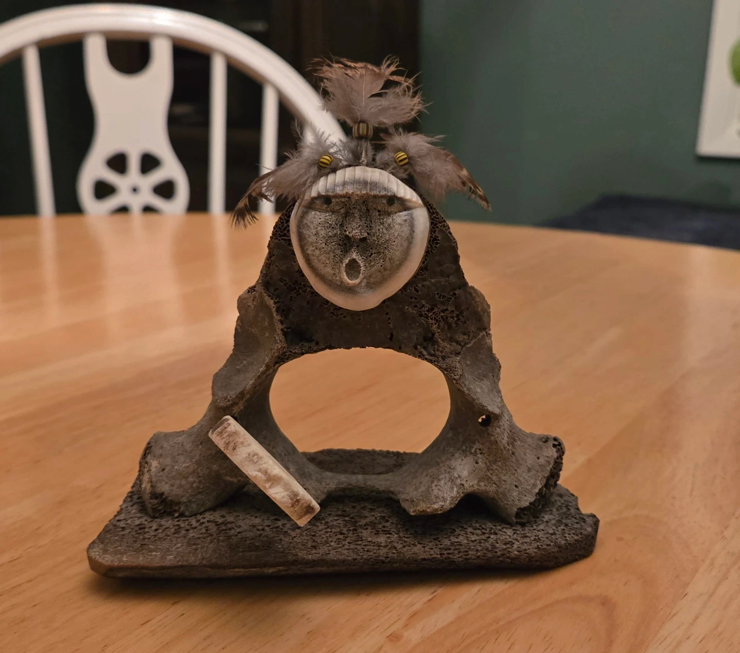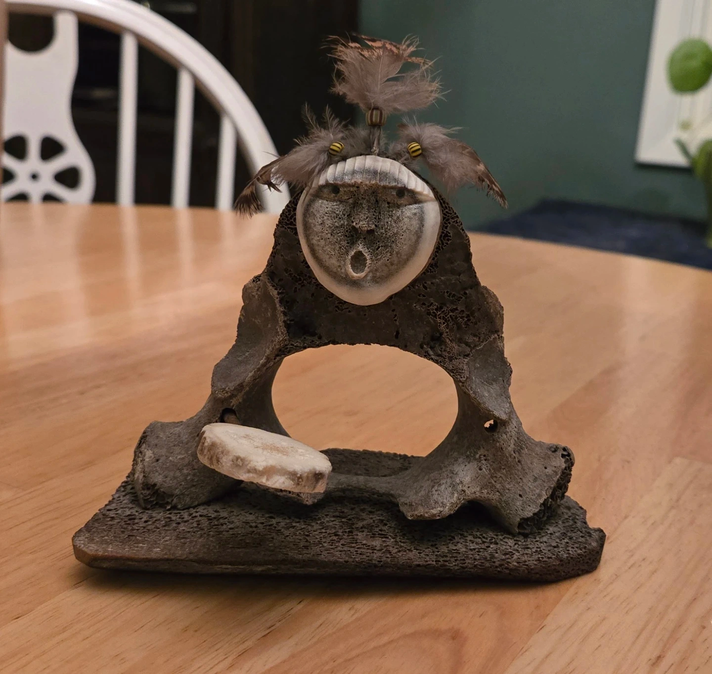 Has a carved face (looks like walrus ivory), and feathers with beads.